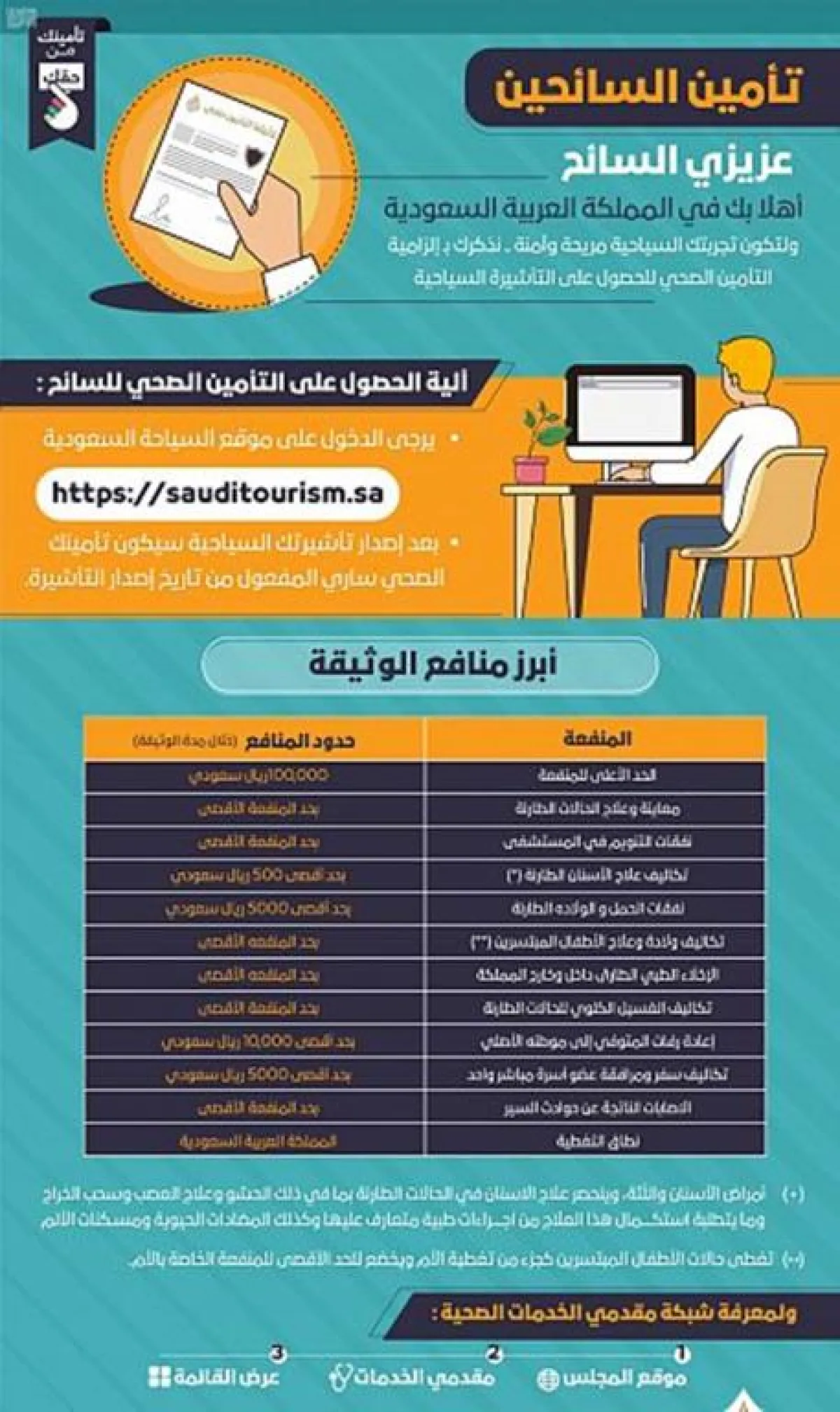 كشف المتحدث الرسمي باسم مجلس الضمان الصحي التعاوني ياسر المعارك، أن وثيقة التأمين الصحي على السائحين تعزز إمداد السائح بالأمان الصحي الذي يكفل لهم التغطية التأمينية الأساسية في جميع مناطق المملكة ضد الأخطار الصحية الطارئة بحد المنفعة الأقصى البالغة 100 مائة ألف ريال سعودي .
