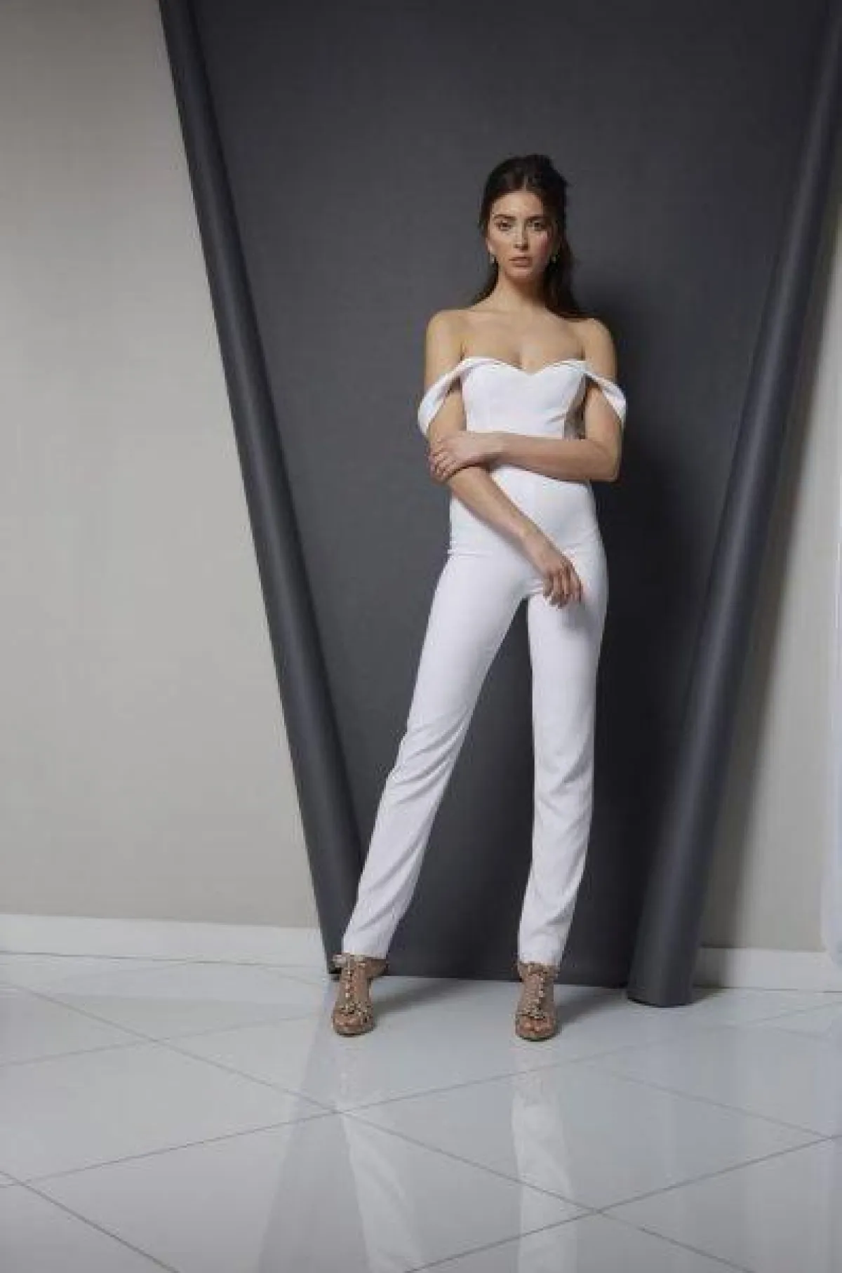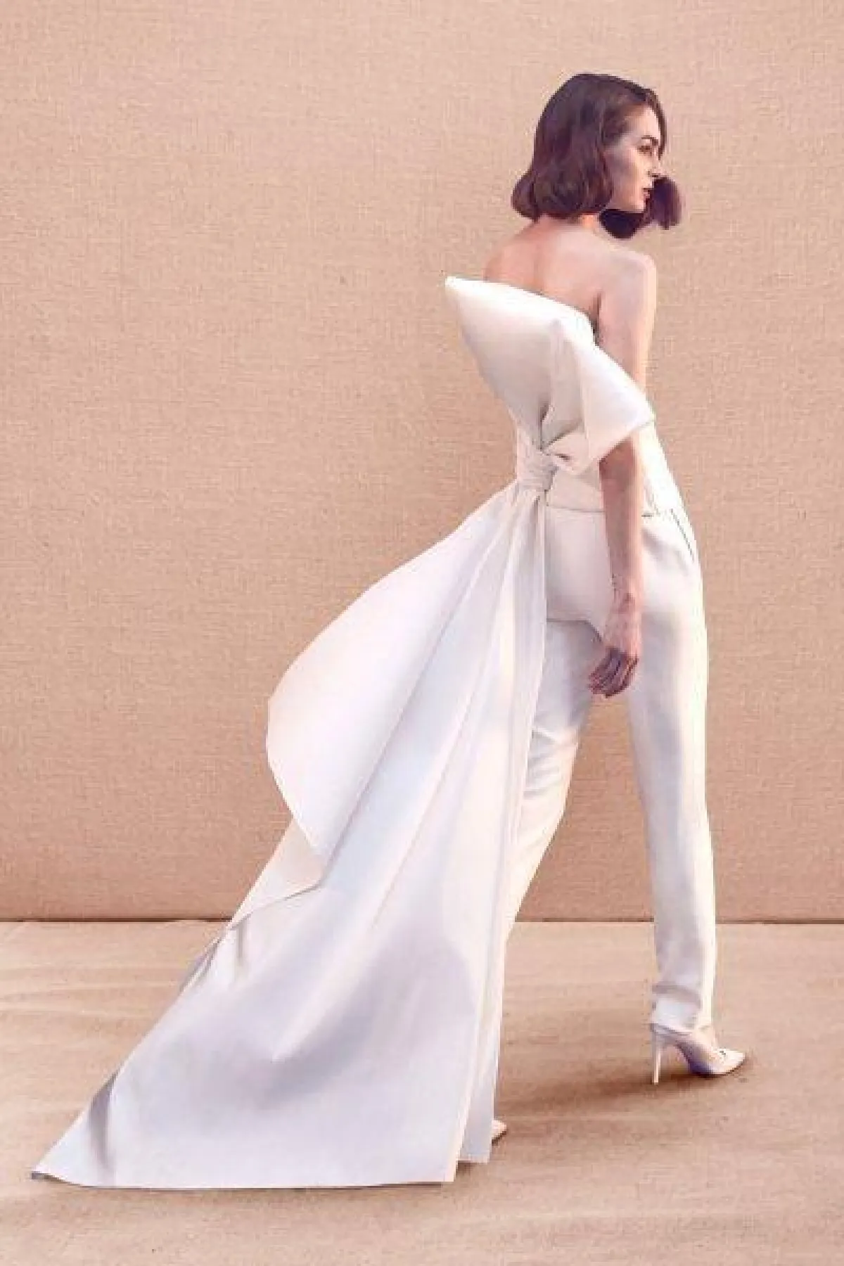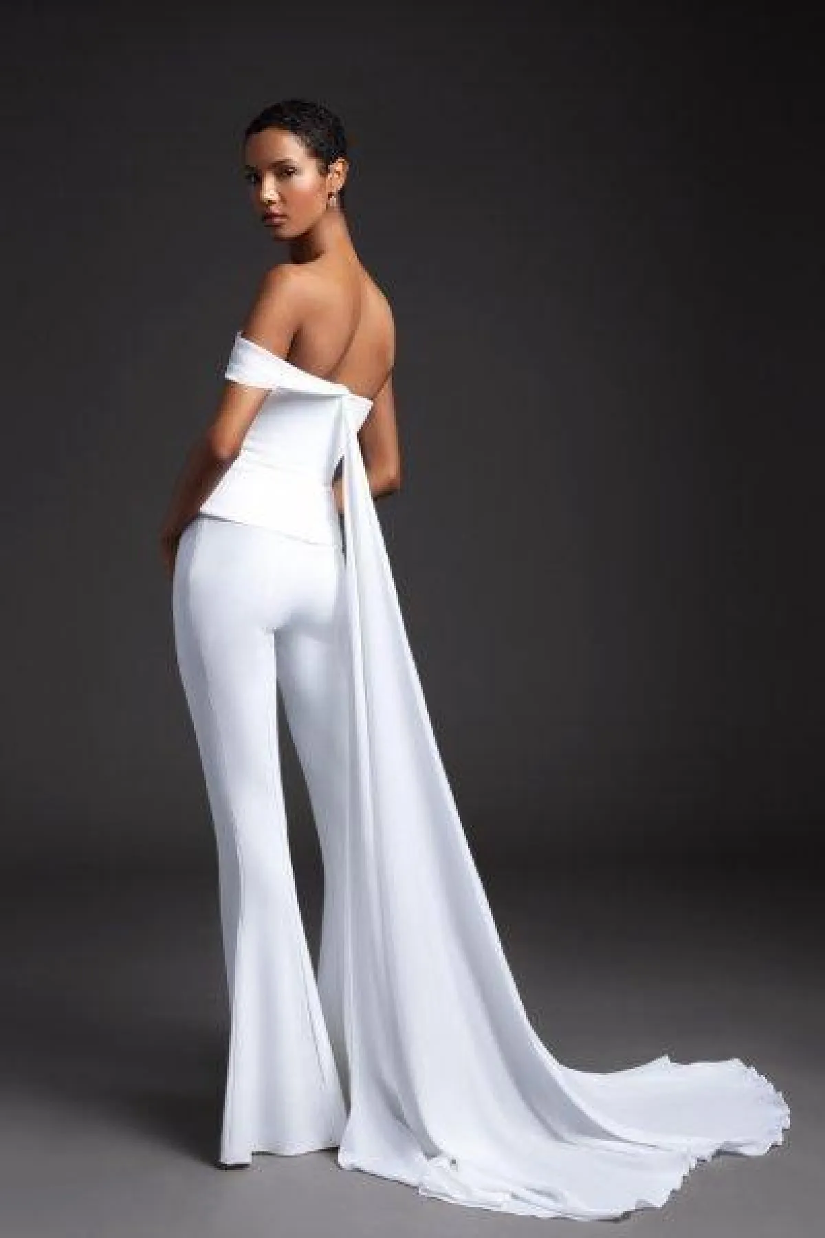 كما يمكن أن تختاره العروس في الحفل الذي يسبق العرس الليلي، أو يمكنها الظهور بإطلالتين في يوم الزفاف، الإطلالة الأولى بالفستان والثانية بالجمبسوت الأبيض.