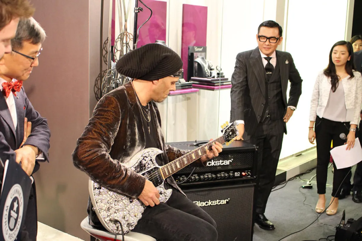 وبعد رفع الستار عن الجيتار الشهير في مارينا مول بالعاصمة الإماراتية أبوظبي عقب دخوله موسوعة جينيس خلال حفلٍ حضره العديد من محبي وعشاق الموسيقى، يعود الجيتار مجدداً إلى أبوظبي ليُعرض خلال نسخة هذا العام من معرض المجوهرات والساعات من 26 - 30 أكتوبر الجاري.
