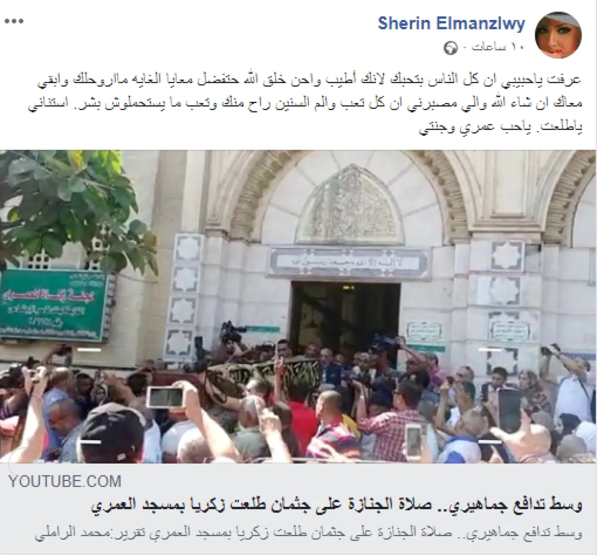 شيرين المنزلاوى نشرت مقطعا من مراسم صلاة الجنازة على جثمان طليقها طلعت زكريا وعلقت عليه عبر حسابها الشخصي بموقع الفيس بوك قائلة: عرفت ياحبيبي ان كل الناس بتحبك لانك أطيب واحن خلق الله.