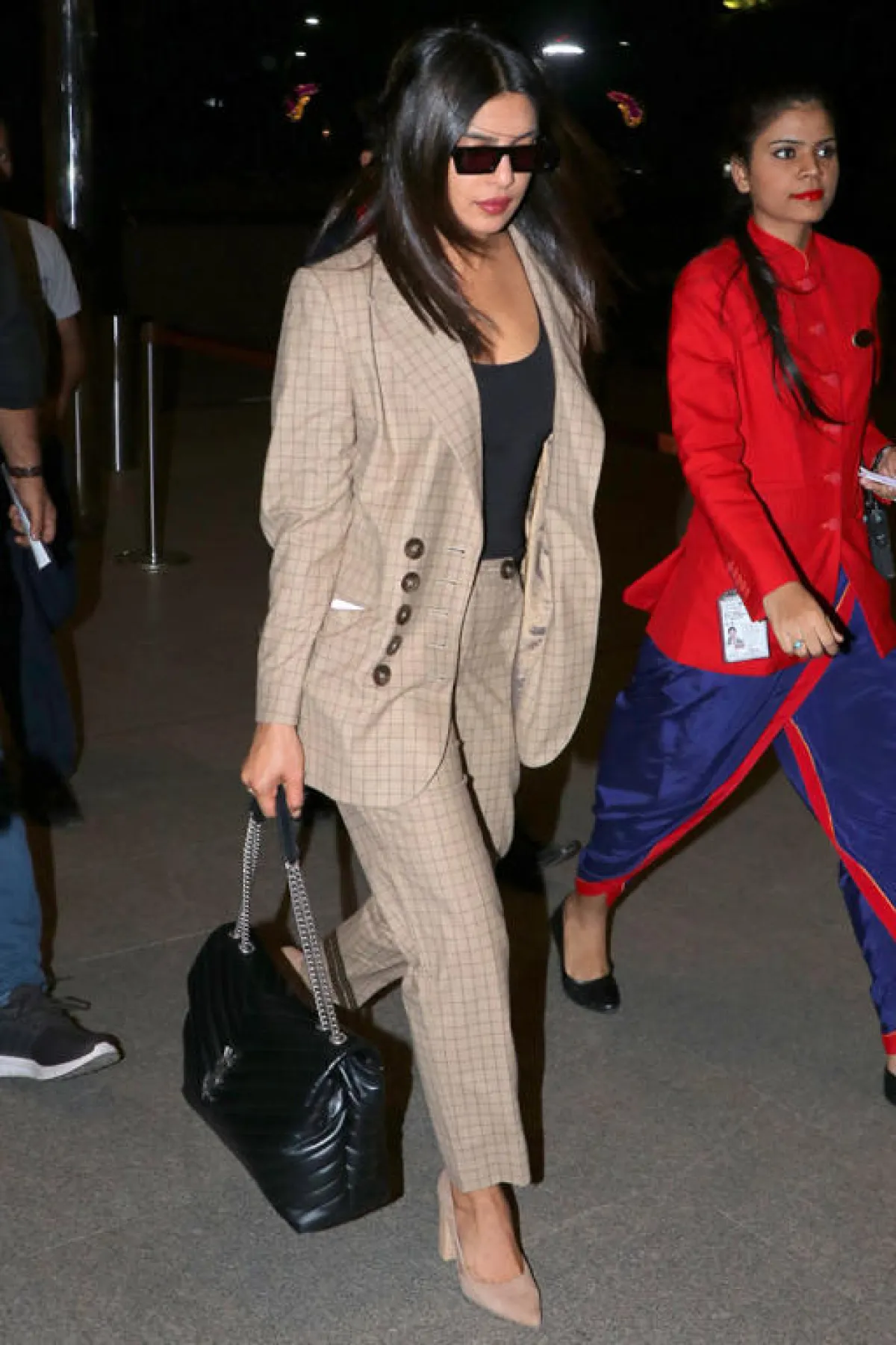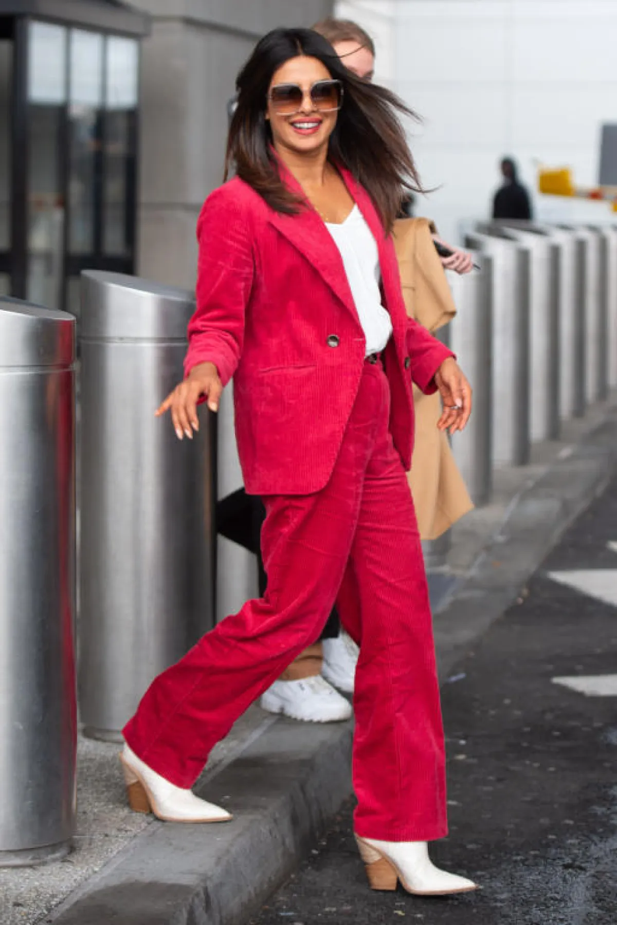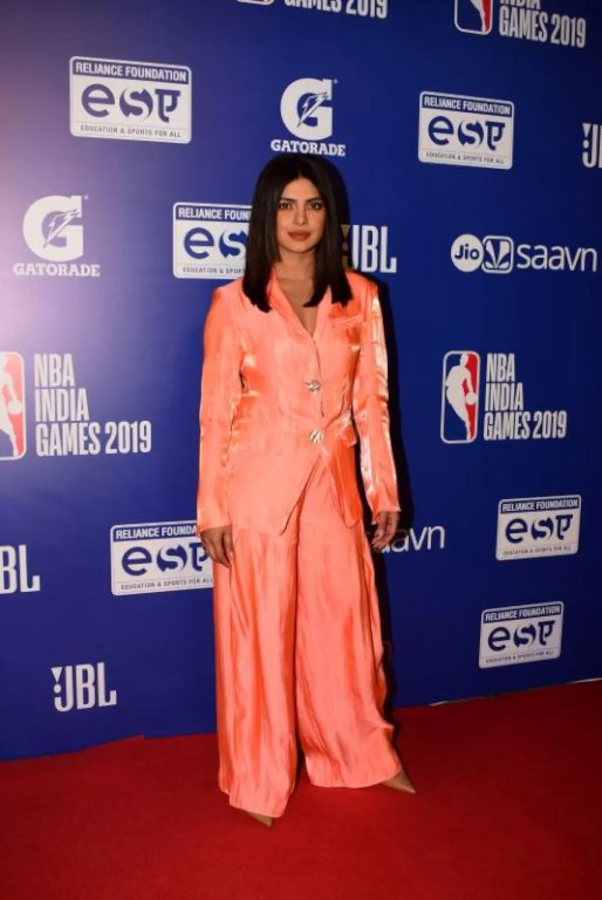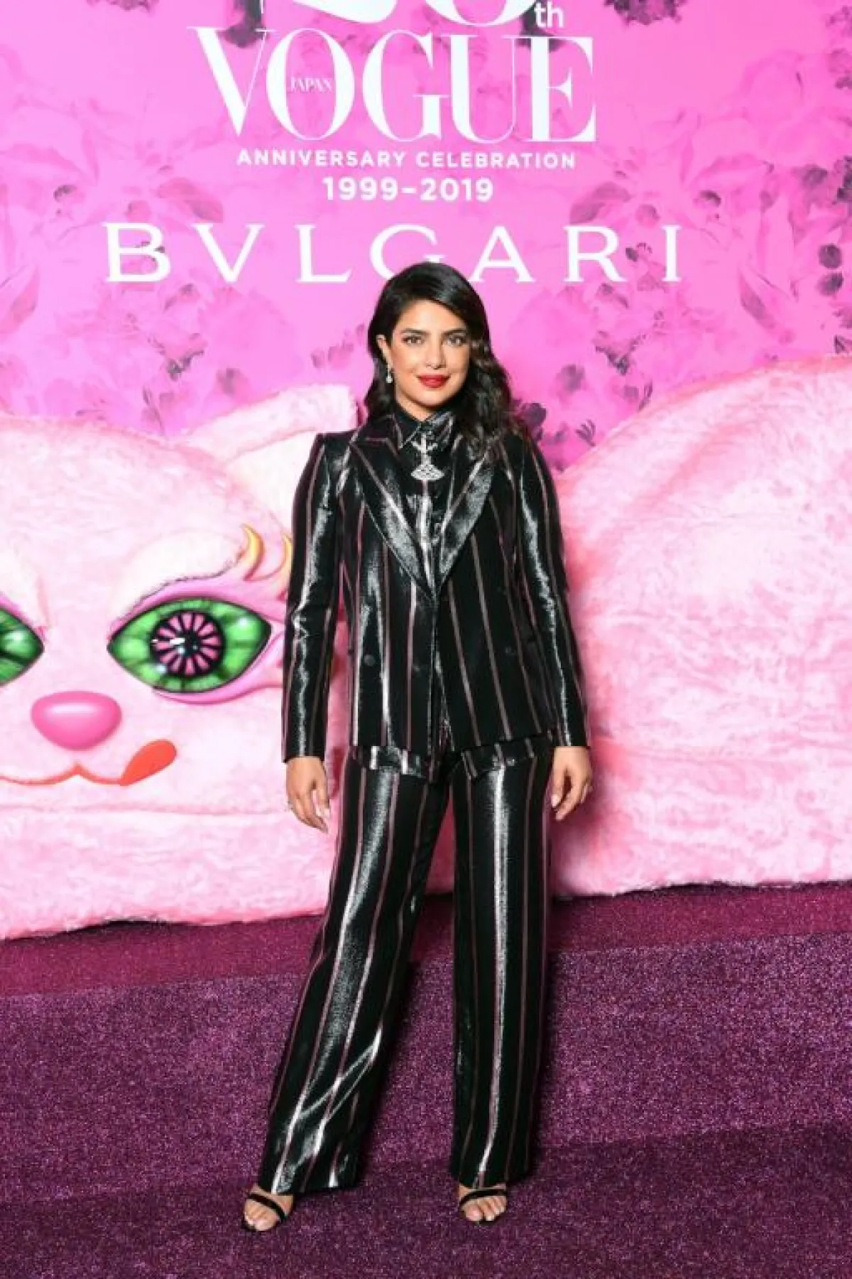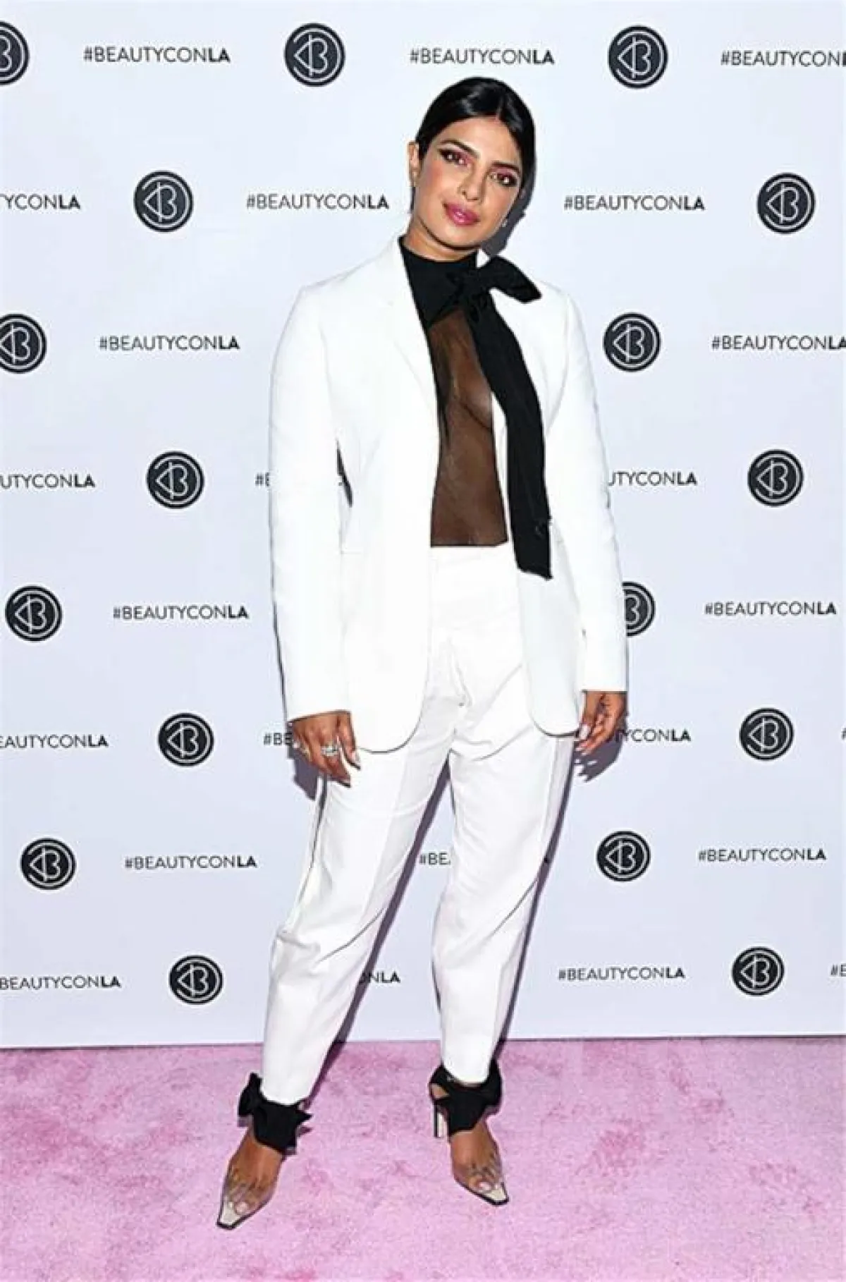 على السجادة الحمراء، وفي إحدى المناسبات مؤخرًا، شاهدنا بريانكا شوبرا Priyanka Chopra وقد اختارت بدلة رسمية باللون الزهري الفاتح، مصنوعة من قماش الساتان بقصة شبابية واسعة، مؤلفة من جاكيت بليزر وبنطلون، وقد نسقت معها حذاءً بكعب عالٍ بتصميم أنثوي مزين من الأمام بشريطة.