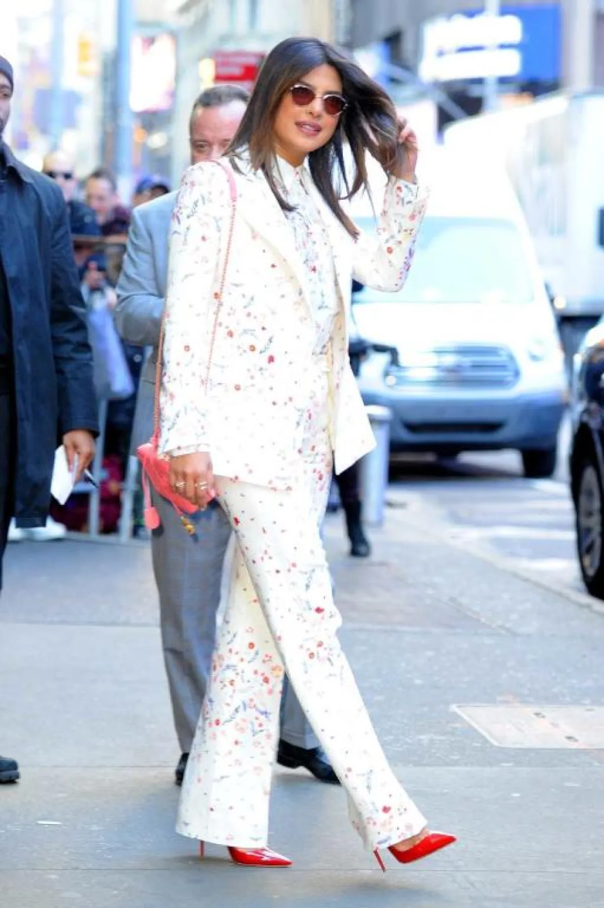 في أحد المشاوير الصباحية، شاهدنا نجمة بوليوود بريانكا شوبرا Priyanka Chopra وقد اختارت اطلالة لافتة في بدلة رسمية باللون الأبيض، مزينة بتعريقات ناعمة ملونة، وقد نسقت معه حذاءً بكعب عالٍ من الجلد باللون الأحمر، وحقيبة كتف باللون الزهري، وأكملت الاطلالة بنظارات شمسية مع عدسات دائرية.