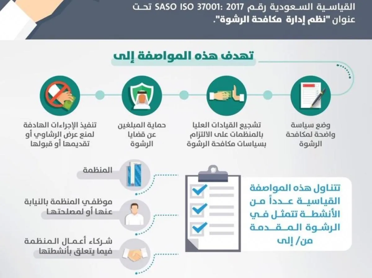 أصدرت هيئة المواصفات والمقاييس، المواصفة القياسية السعودية الجديدة بعنوان "نظم إدارة مكافحة الرشوة"، وذلك بالتعاون مع الهيئة الوطنية لمكافحة الفساد "نزاهة" والنيابة العامة.