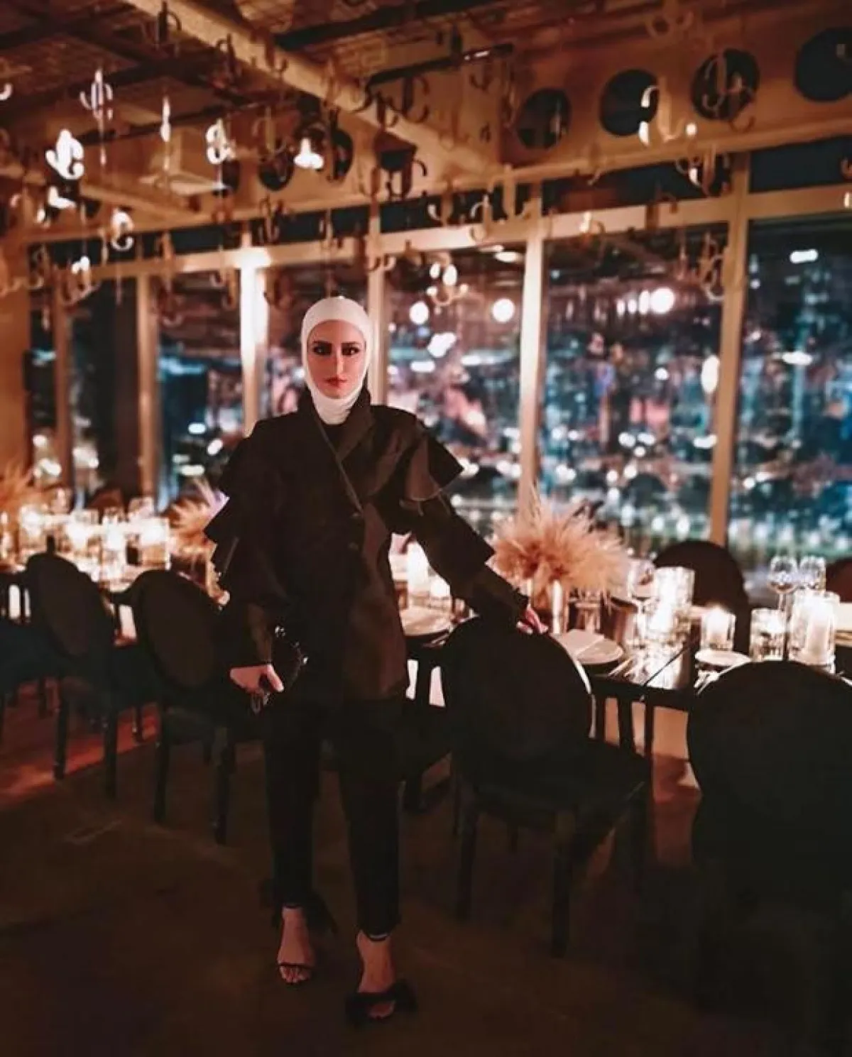 لا تتخلى دلال الدوب عن اطلالة البدلة منذ أن ظهرت كصيحة أساسية بكل المواسم، واعتمدتها بأسلوبها الخاص، بألوان مبهجة كالبدلة بلون التركواز مع السنيكرز والتوب، والطرحة باللون الأبيض، للمسة شبابية للوك ككل.