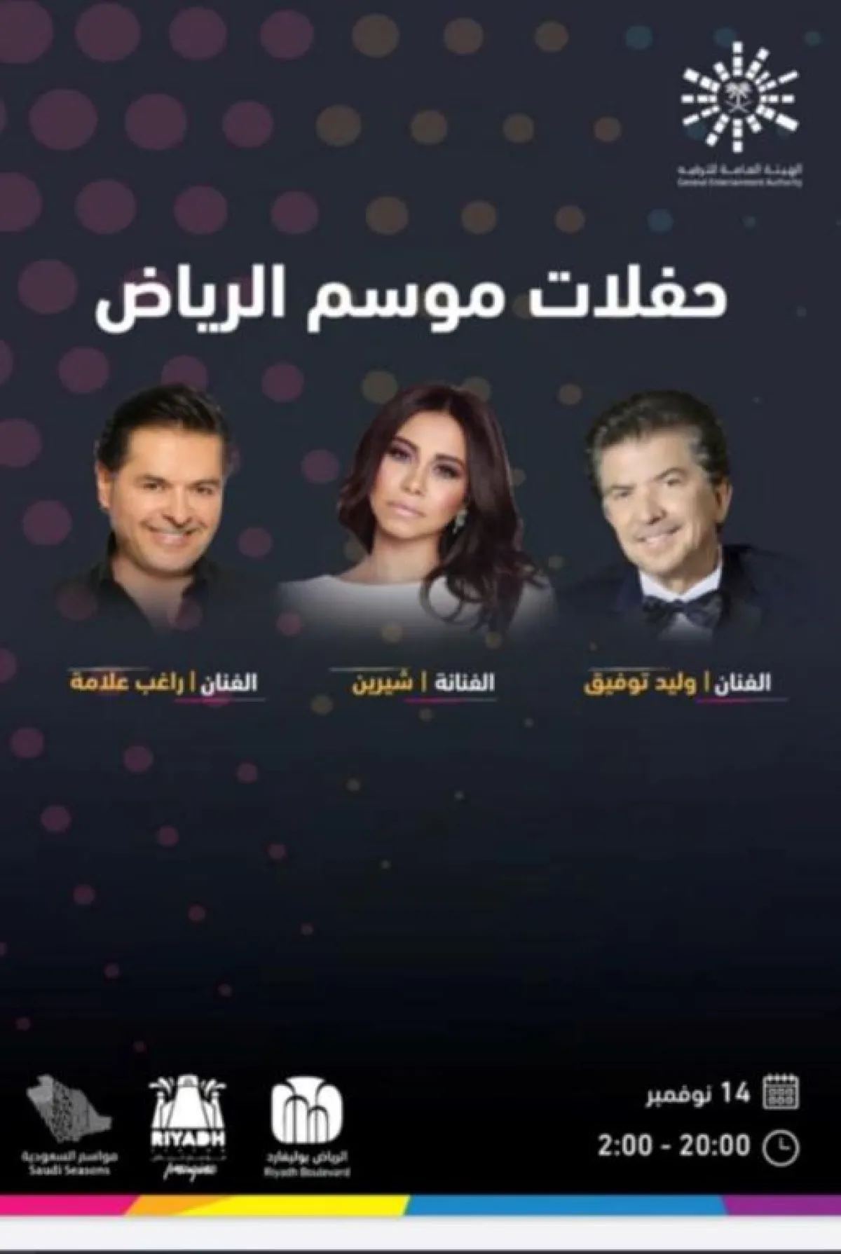 - حفلات "لايف نيشن" العالمية: أبرز شركة متخصصة في الترفيه الحي في العالم، إذ ستنظم 5 حفلات غنائية.