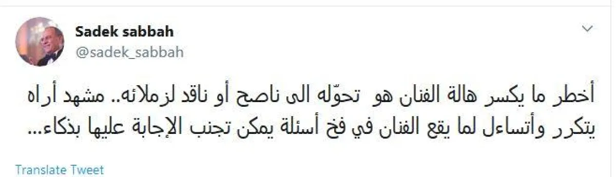 وكتب الصباح تغريدة عبر حسابه الخاص على "تويتر"، رأى فيها أنّه "أخطر ما يكسر هالة الفنان هو تحوّله الى ناصح أو ناقد لزملائه".
