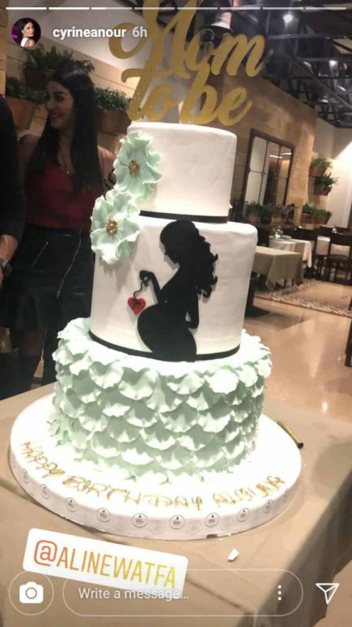 يشار إلى أنه سبق أن تم الكشف عن حمل ألين وطفا بطريقة غير مقصودة، خلال الاحتفال بعيد ميلادها، حيث نشرت الفنانة سيرين عبد النور صورة على كعكة عيد ميلاد ألين ببطن منتفخ، تؤكد حملها.