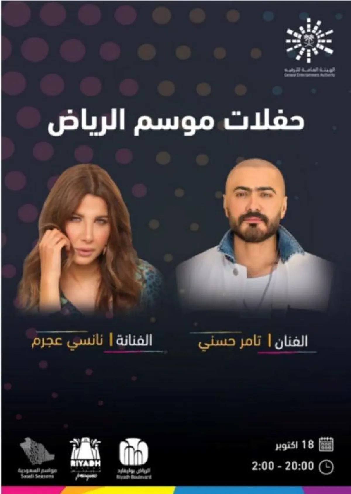 كذلك، يلتقي الفنان تامر حسني، والفنانة نانسي عجرم جمهورهما في 18 أكتوبر، وفي 28 أكتوبر يجتمع الفنان صابر الرباعي، وأصالة نصري، ونوال الزغبي في حفلة فريدة من نوعها.