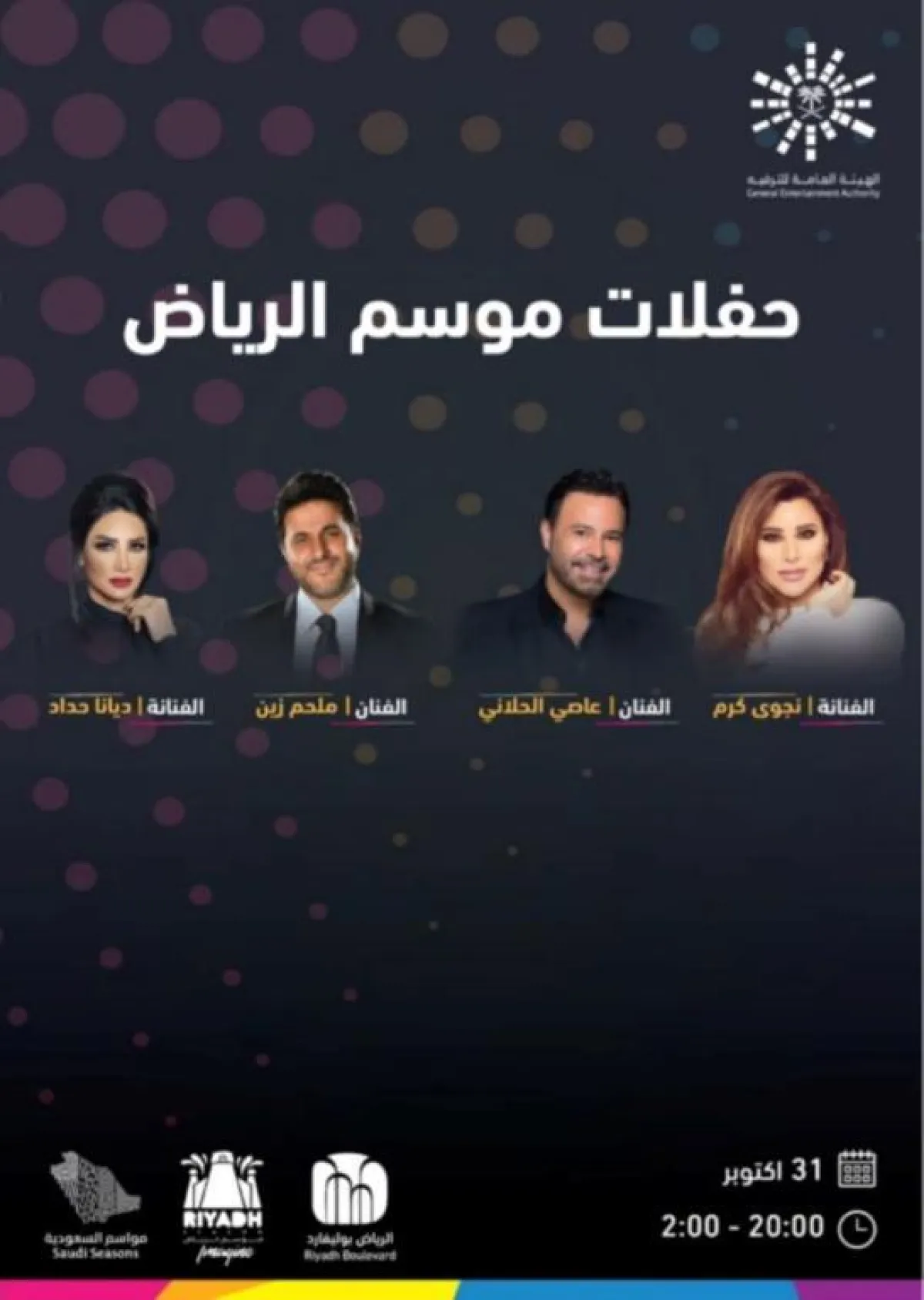كما يستمتع الجمهور بصوت نجوى كرم، وعاصي الحلاني، وملحم زين، وديانا حداد في 31 أكتوبر،.