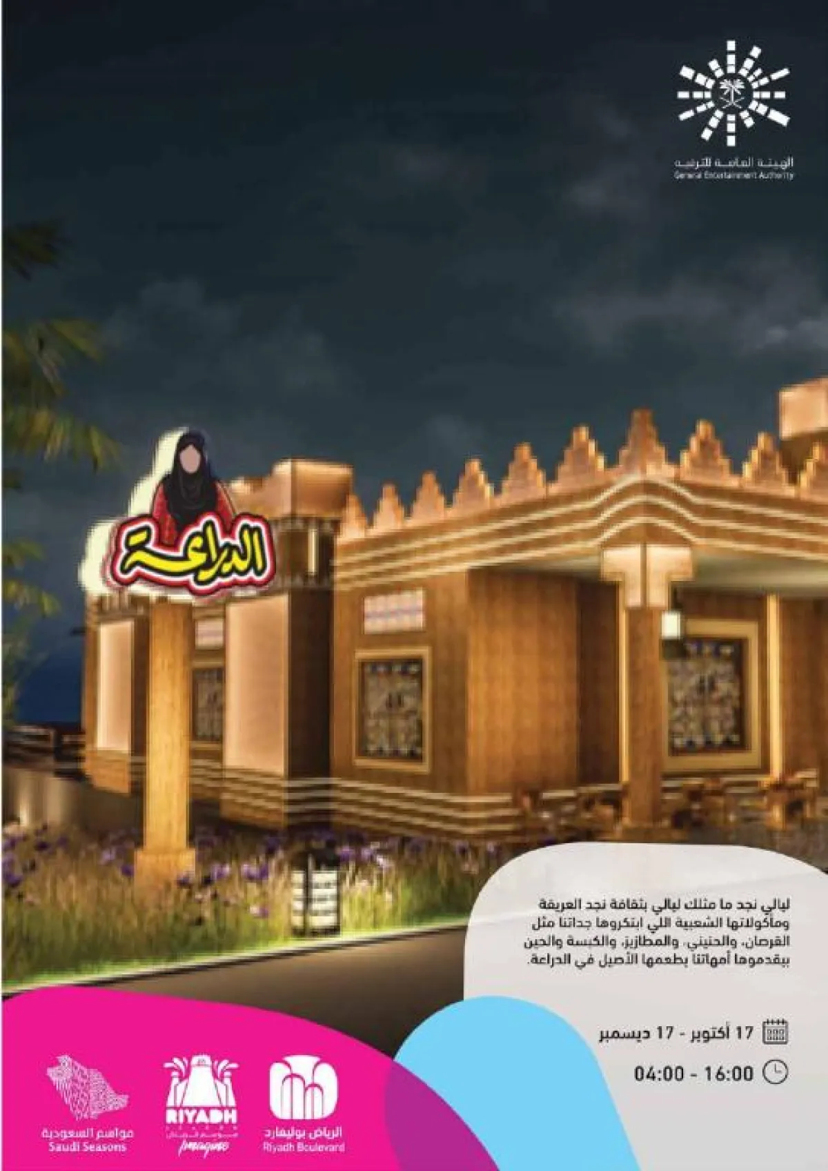 تضم هذه الليالي بالتأكيد تعريفًا بالسعودية، وسيكون ذلك خلال فعالية "الدراعة" التي تهدف لعرض ثقافة نجد العريقة، ومأكولاتها من "القرصان" و"الحنيني" و"المطازيز" و"الكبسة"، بتقديم الأمهات تأكيدًا على أصالتها العريقة، وتبدأ هذه الفعاليات المميزة من 17 أكتوبر وتستمر لمدة شهر.