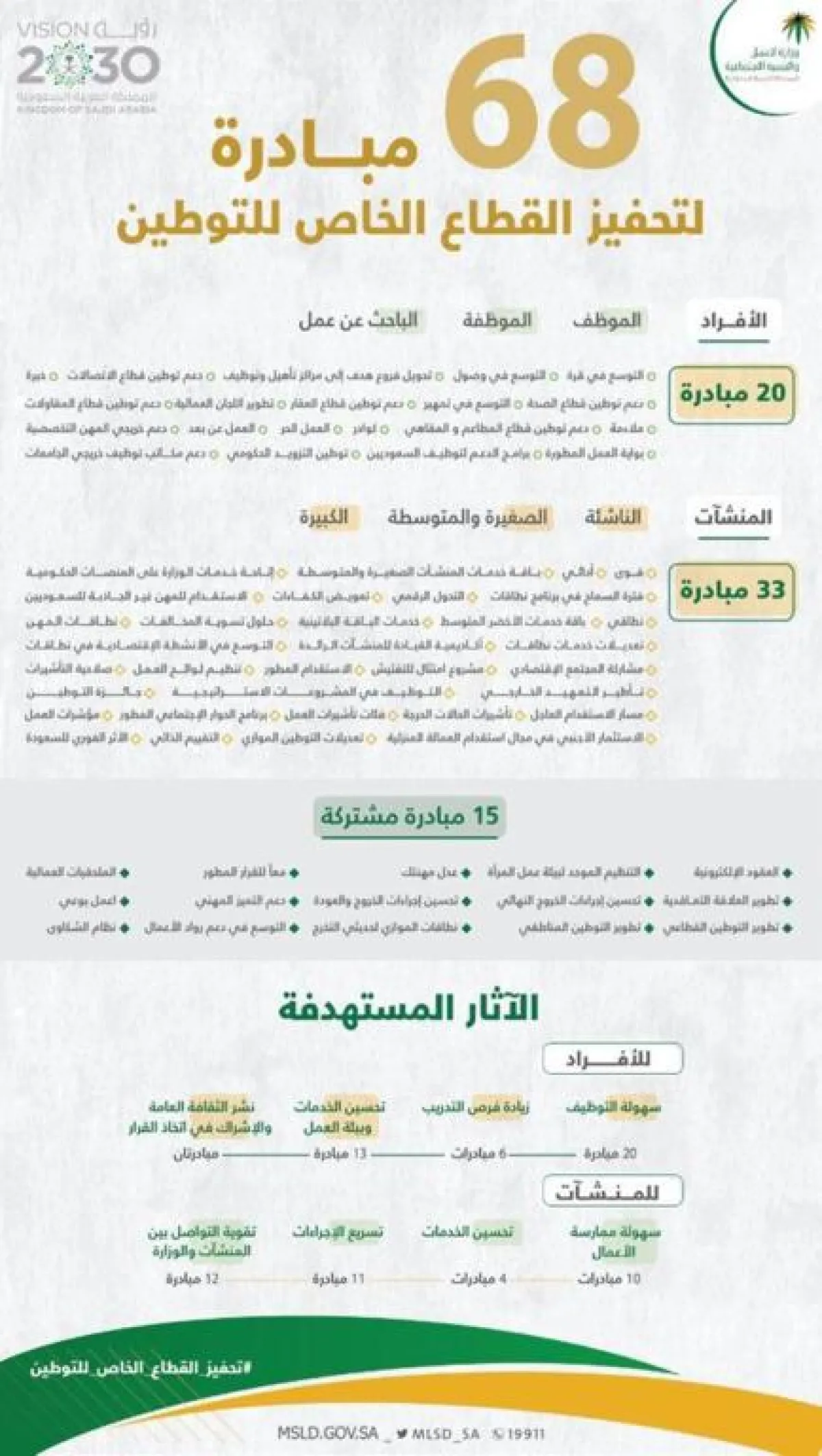 وأسهمت جهود وزارة العمل والتنمية الاجتماعية في دعم وتحفيز القطاع الخاص للنمو والتوسع في التوطين، وتمكين رواد الأعمال والمنشآت الناشئة والصغيرة؛ حيث أطلقت الوزارة نهاية العام الماضي 68 مبادرة لتحفيز القطاع الخاص على النمو، كما قامت الوزارة بتطوير اجراءات الاستقدام، وإطلاق منصة قوى ومواصلة التحول الرقمي وأتمتة الخدمات، وإتاحة خدماتها على منصات الجهات الحكومية الأخرى، وإتاحة التقييم الذاتي للمنشآت للتحفيز على الامتثال للأنظمة سوق العمل ولوائحه.