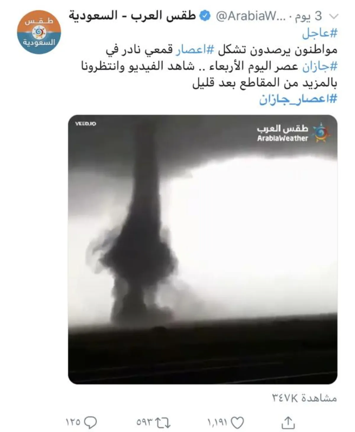 اعصار جازان والذي حدث قبل ثلاثة أيام ووصل للترند في السعودية من خلال هاشتاق على برنامج التواصل الاجتماعي تويتر، حيث قام الكثير بمشاركة فيديوهات وصور توثق اعصار جازان النادر الحدوث.