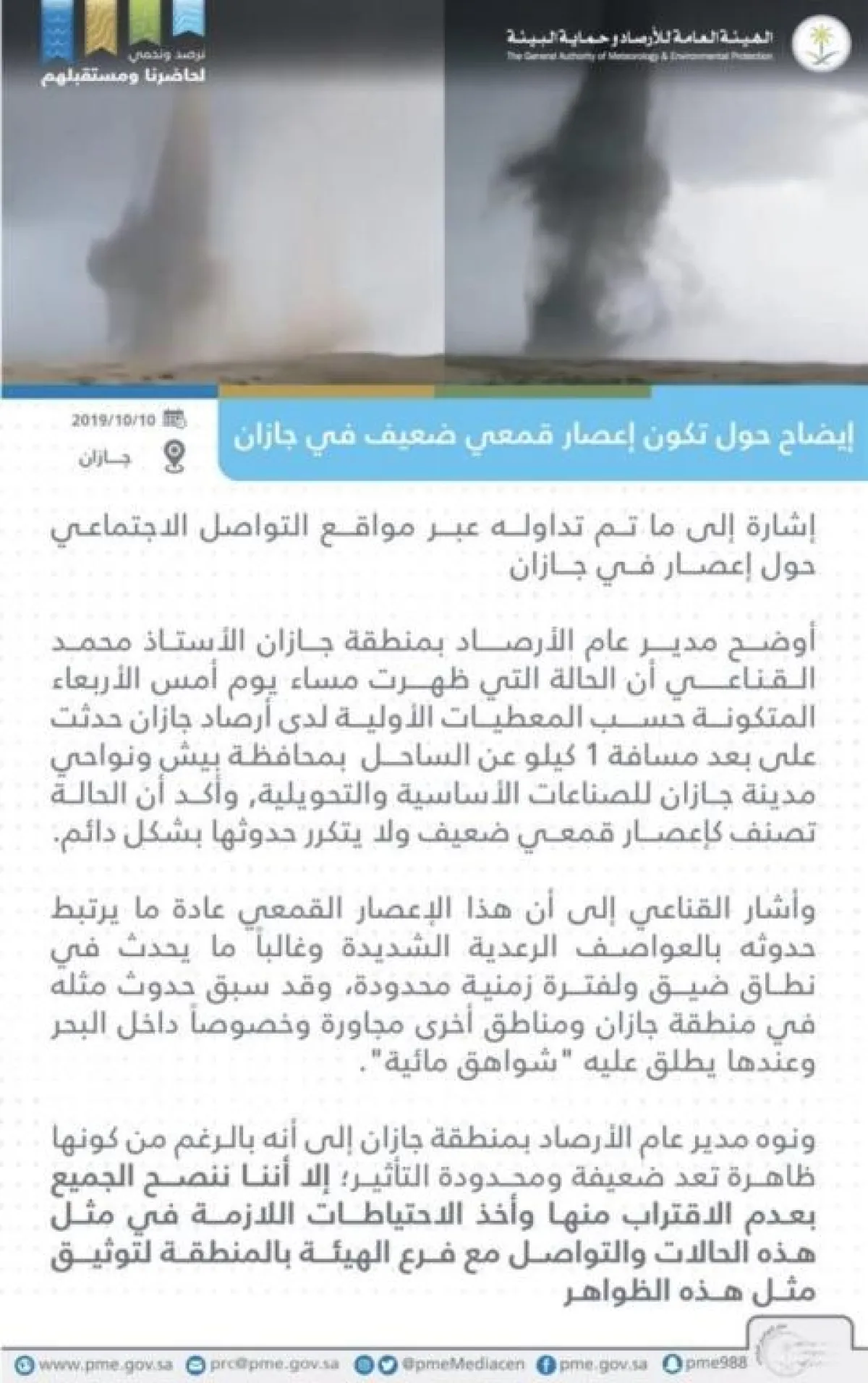 ونوه مدير عام الأرصاد بجازان أنه بالرغم من كونها ظاهرة تعد ضعيفة ومحدودة التأثير، إلا أننا يجب على الجميع عدم الاقتراب منها وأخذ الاحتياطات اللازمة في مثل هذه الحالات والتواصل مع فرع الهيئة بالمنطقة لتوثيق مثل هذه الظواهر.