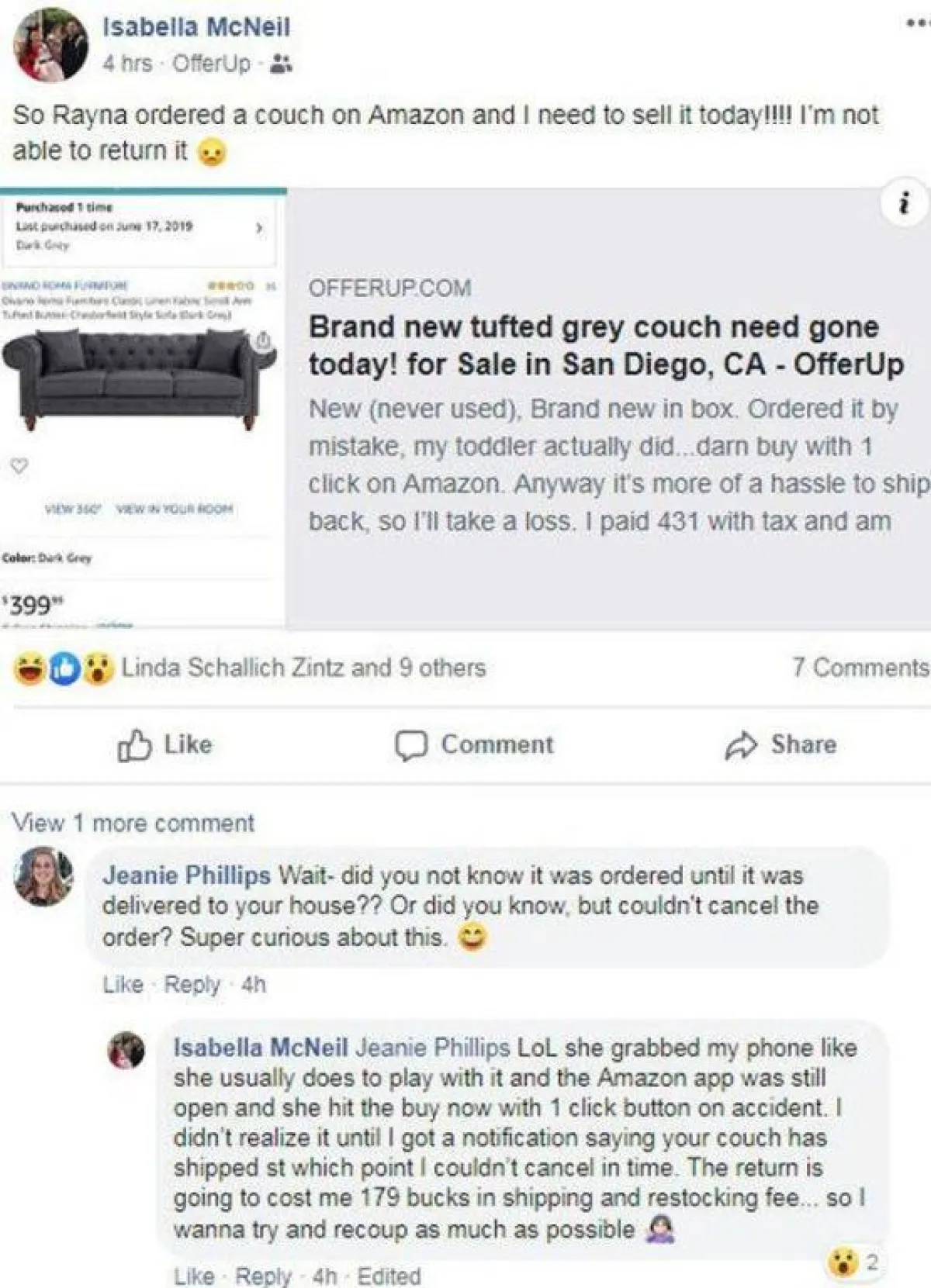 حاولت إيزابيلا إلغاء الطلبية ولكن الأوان كان قد فات، فقرّرت إعادة بيع الأريكة بخسارة على الإنترنت. فنشرت صورة لها وكتبت: «العلامة التجارية الجديدة طلبت عن طريق الخطأ، طفلتي الصغيرة فعلت ذلك... بضغطة واحدة على أمازون. على أي حال، سيكون الأمر أكثر صعوبة في إعادة الشحن، وسأخسر».