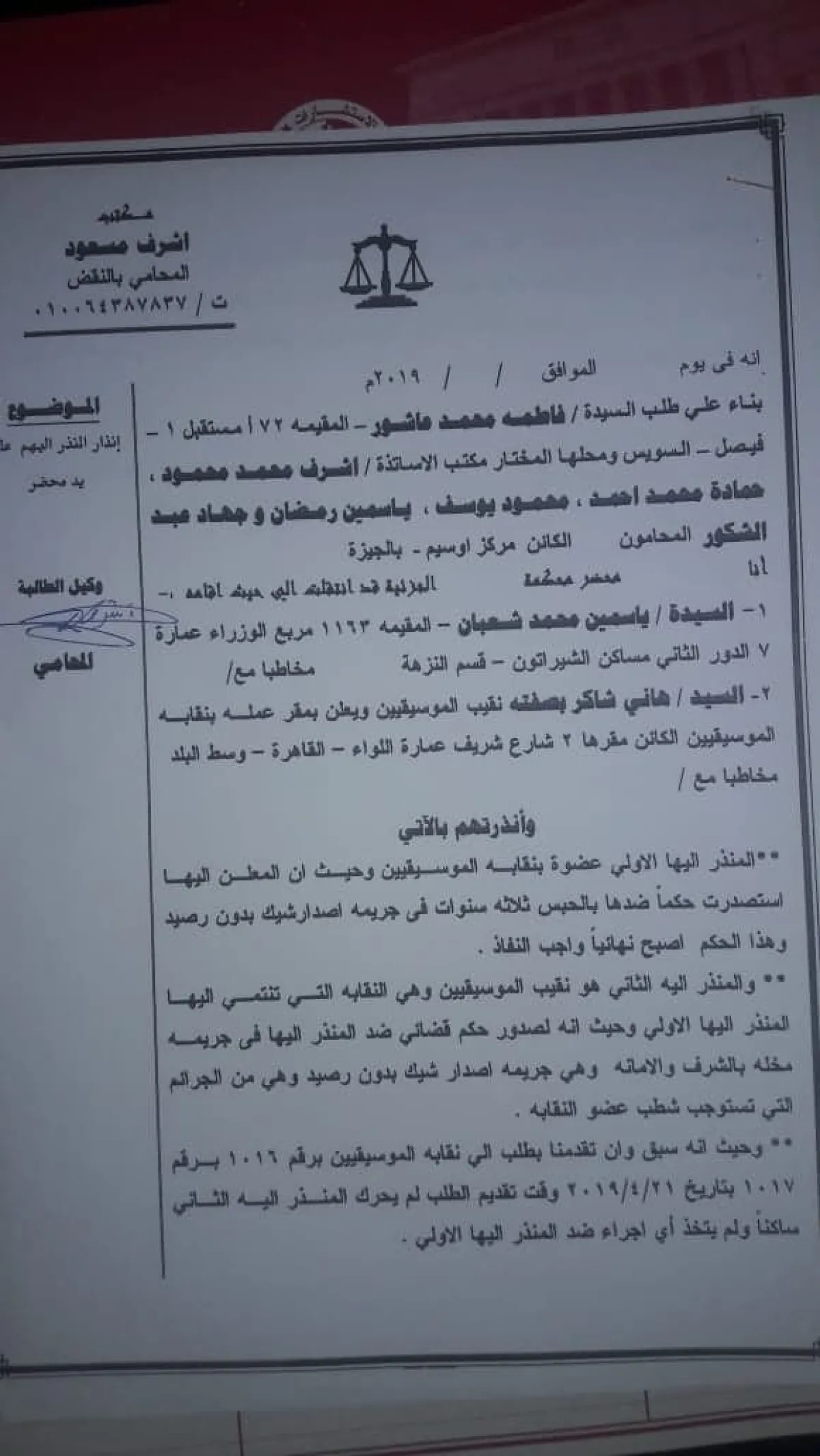 ويفيد الإنذار بضرورة شطب عضوية بوسي من نقابة المهن الموسيقية، وذلك لأن جريمة إصدار شيك بدون رصيد هي من الجرائم المخلة بالشرف والأمانة، وهو ما يستوجب شطبها وفقا للقانون وللائحة النقابة.