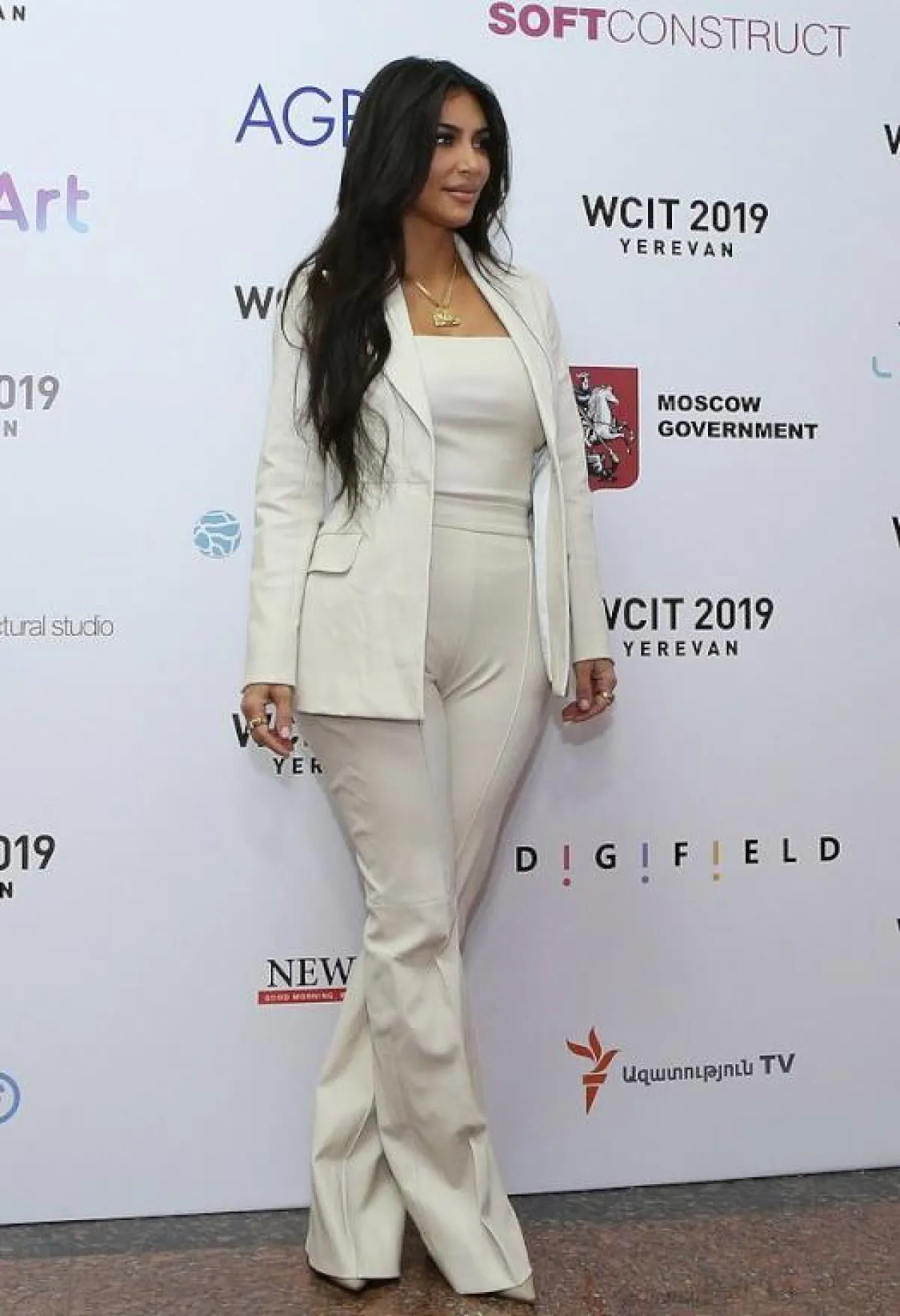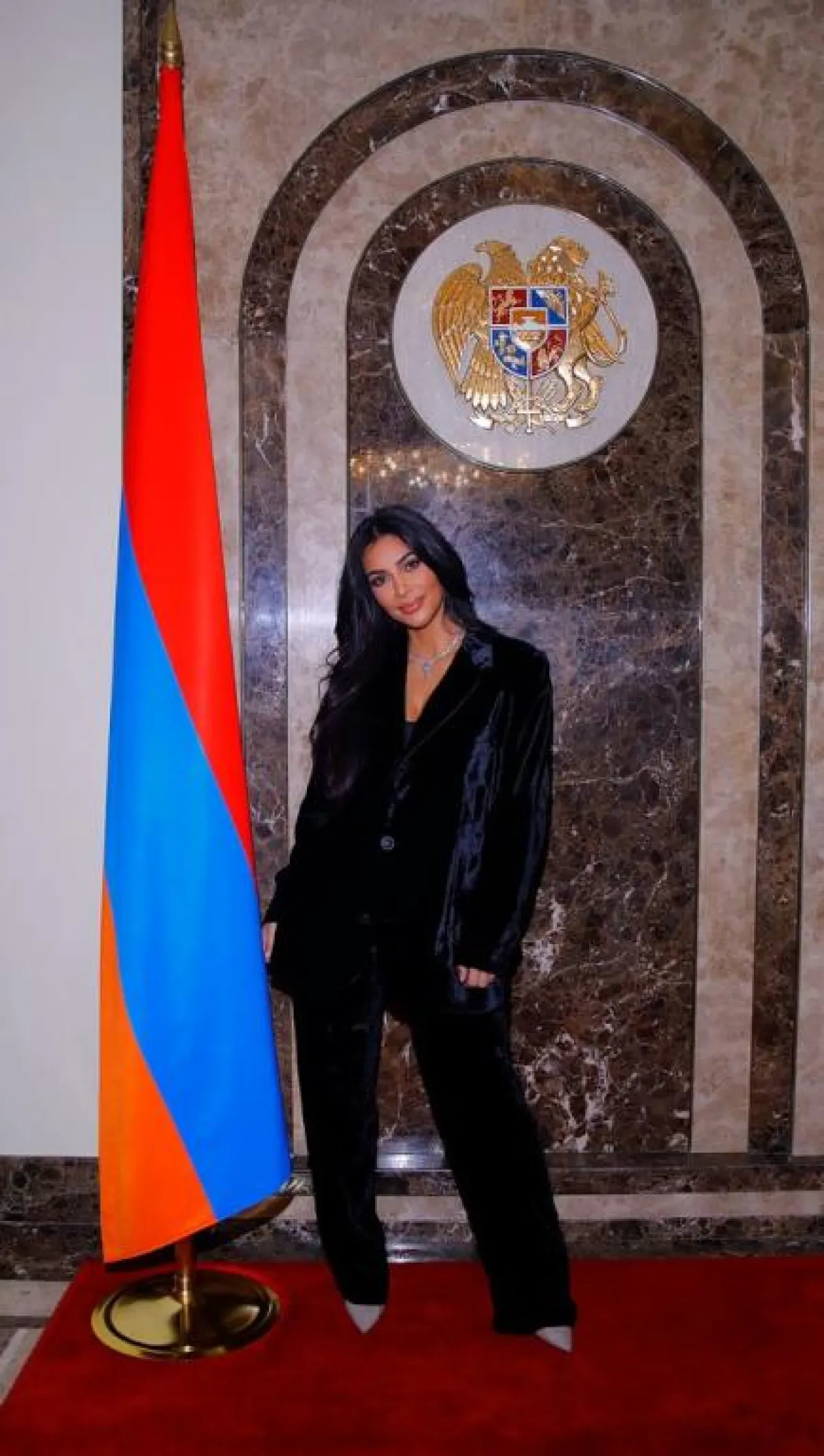 قامت كيم كارداشيان Kim Kardashian بزيارة رئيس أرمينيا، ولهذه المناسبة الرسمية اعتمدت اطلالة أنيقة في بدلة باللون الأسود مصنوعة من المخمل، ومؤلفة من جاكيت بليزر وبنطال بقصة واسعة، وقد نسقت معهما حذاءً بكعب عالٍ باللون البيج، وعقدًا ماسيًّا ناعمًا.