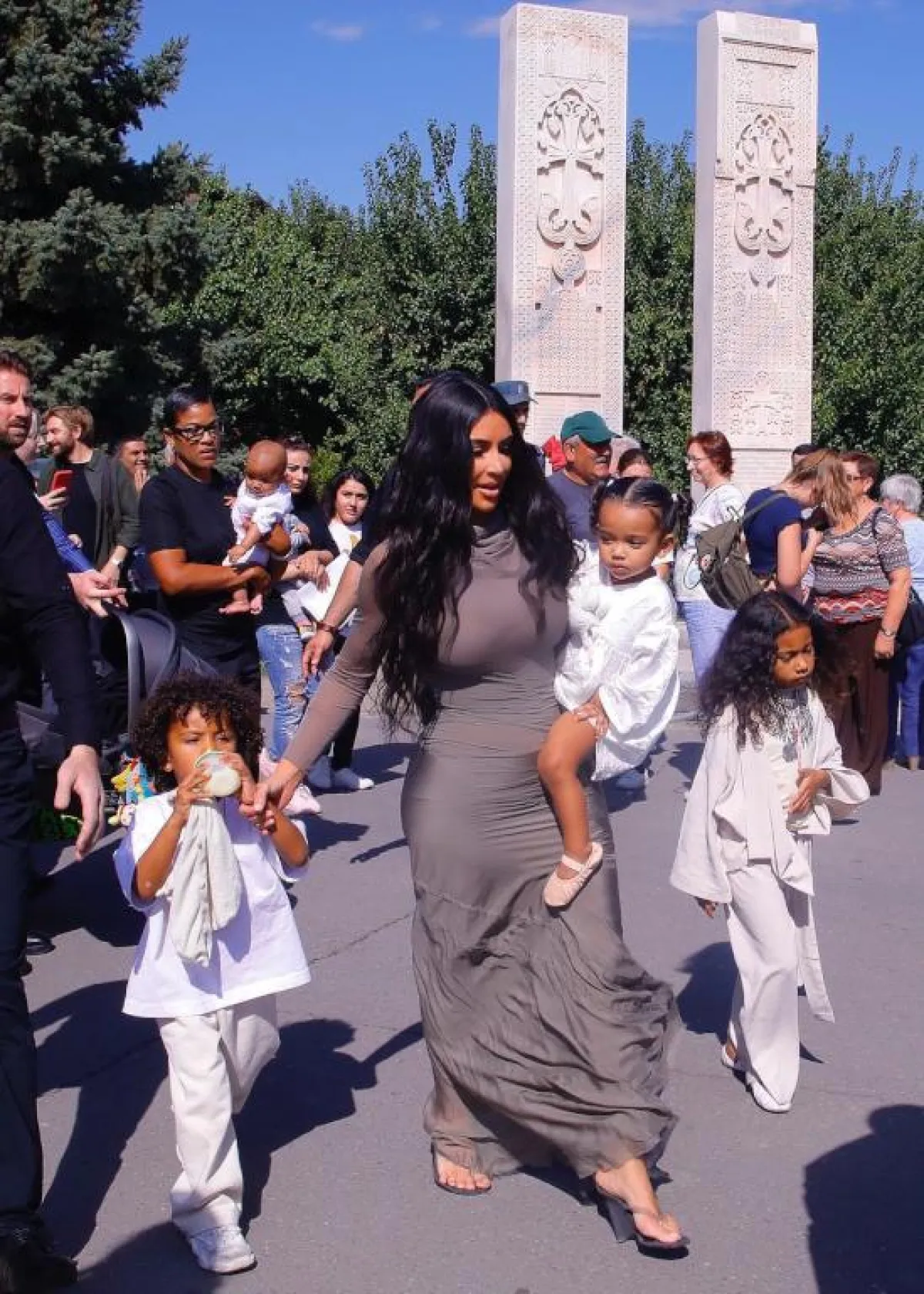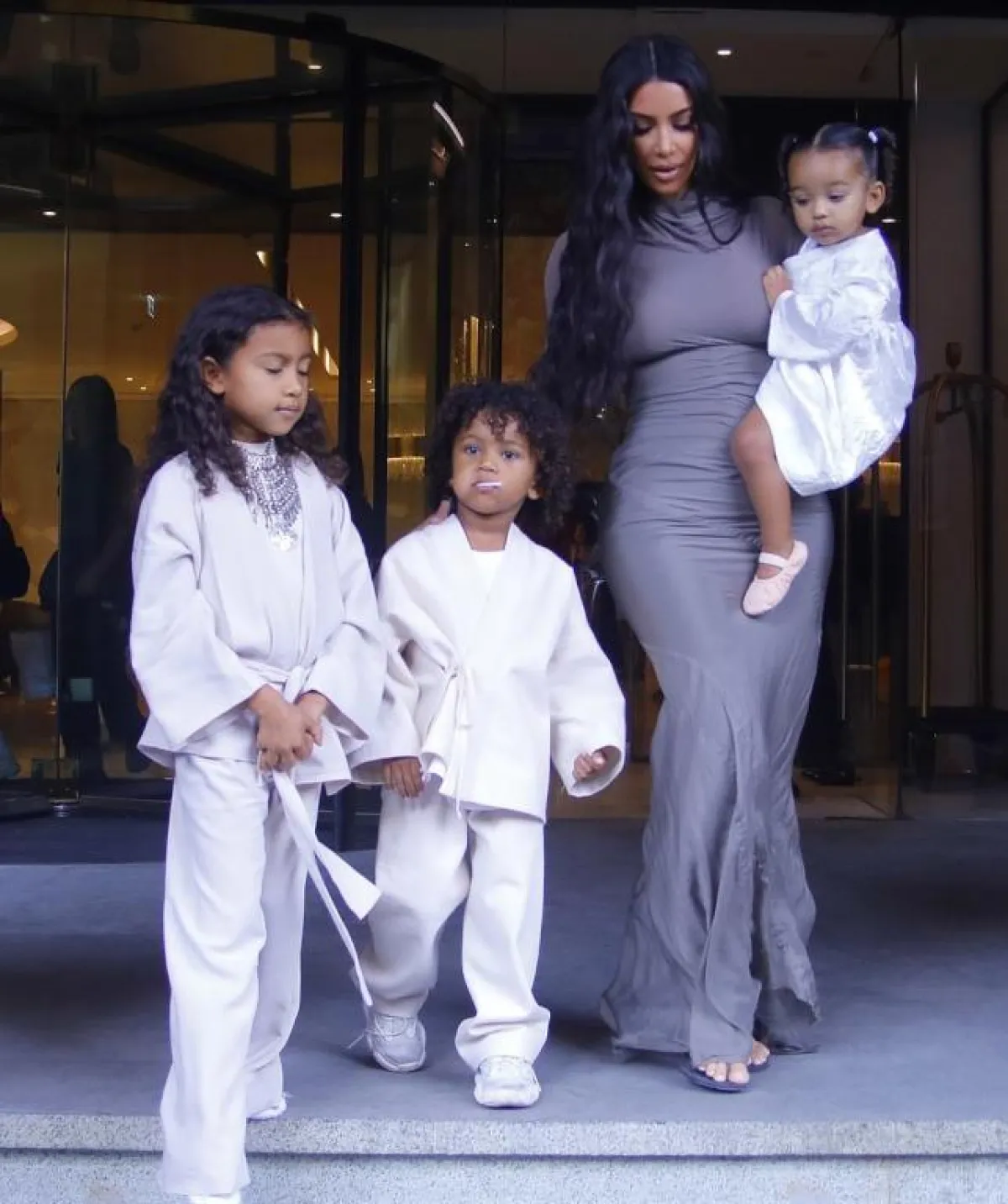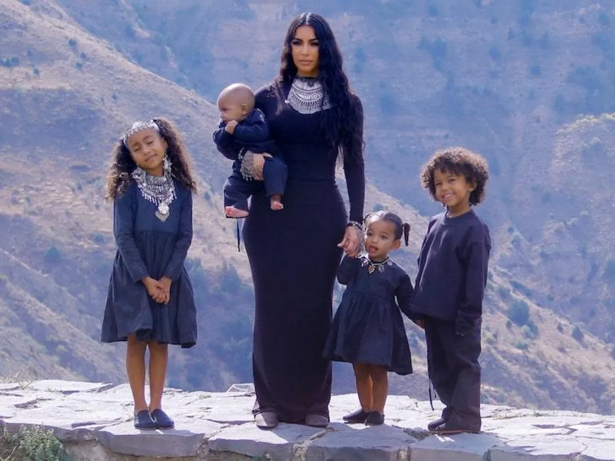 في اطلالة لافتة اختارتها كيم كارداشيان Kim Kardashian مؤخرًا في أرمينيا، في فستان ماكسي مصنوع من قماش الحرير باللون الرمادي، قصته بسيطة مع ياقة عالية وأكمام طويلة، وقد نسقت معه صندلًا بكعب عالٍ من البلاستيك الشفاف، وكانت قد اختارت لأطفالها برفقتها اطلالات باللون الأبيض، وميزت ابنتها الكبرى نورث North بعقد كبير من الفضة.