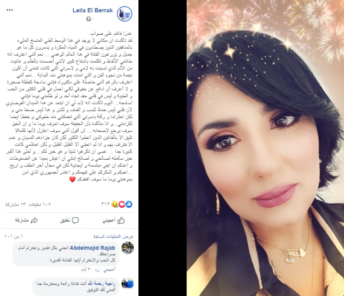 أضافت: اليوم تأكدت انه لابد لي ان ابتعد عن هذا الميدان الفوضوي لأن قلبي ليس حملا للسب والقدف وللشر وهذا ليس ضعفا مني ولكن احتراما ورأفة بأسرتي التي تحملتني مند طفولتي وحفظا ايضا لكرامتي...وانا متأكدة بأن الحقيقة سوف تعرف يوما ما وان الحق سوف يرجع لأصحابه.