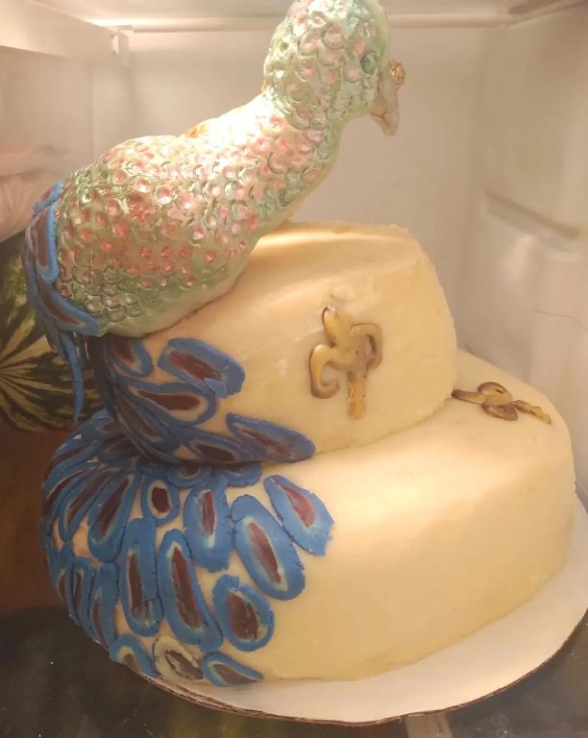 وتم تبرير الأمر بأن نقل الكعكة إلى منزل العروس استغرق وقتاً طويلاً، لذا سقطت رأس الطاووس وتفككت الكعكات من بعضها البعض قليلاً، بحسب شبكة «فوكس نيوز» الأمريكية، و«العين».