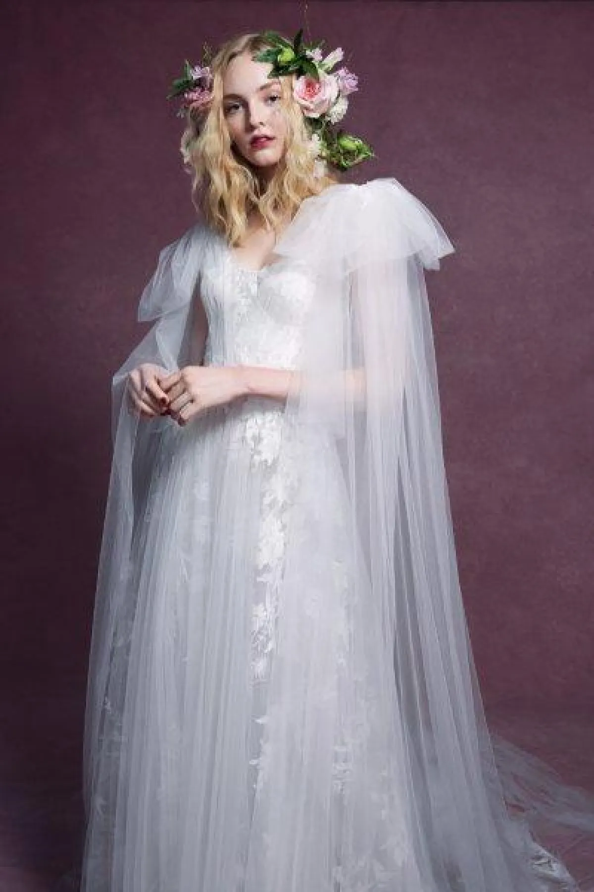 قدمت ماركة آن بيرغ Anne Barge فستان زفاف بكاب قصير من التول ومزين بتطريزات مستوحاة من الطبيعة.