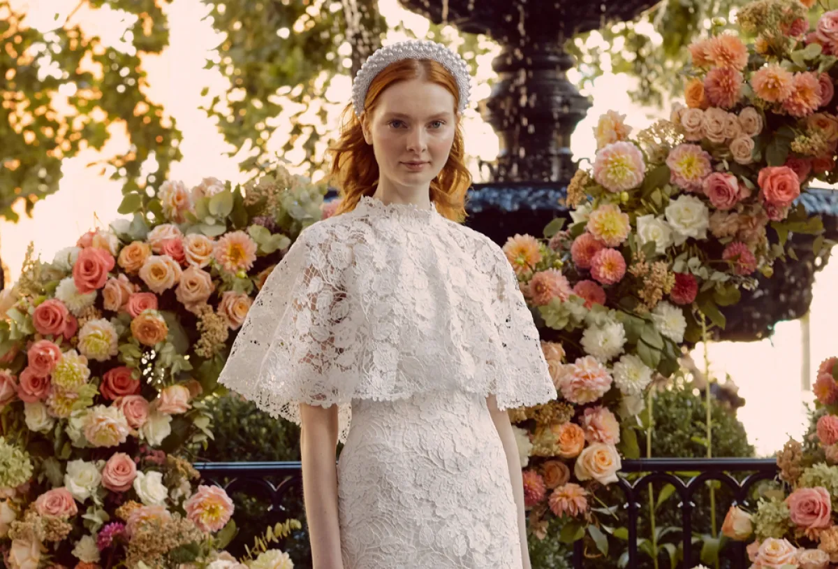 كما قدمت ماركة ليلا روز Lela Rose فستان زفاف دانتيل بكاب قصير يتمتع بطابع كلاسيكي راقي لا تنتهي موضته بمرور السنين، حيث يذكرنا بفساتين زفاف أميرات القصور الملكية في الماضي.