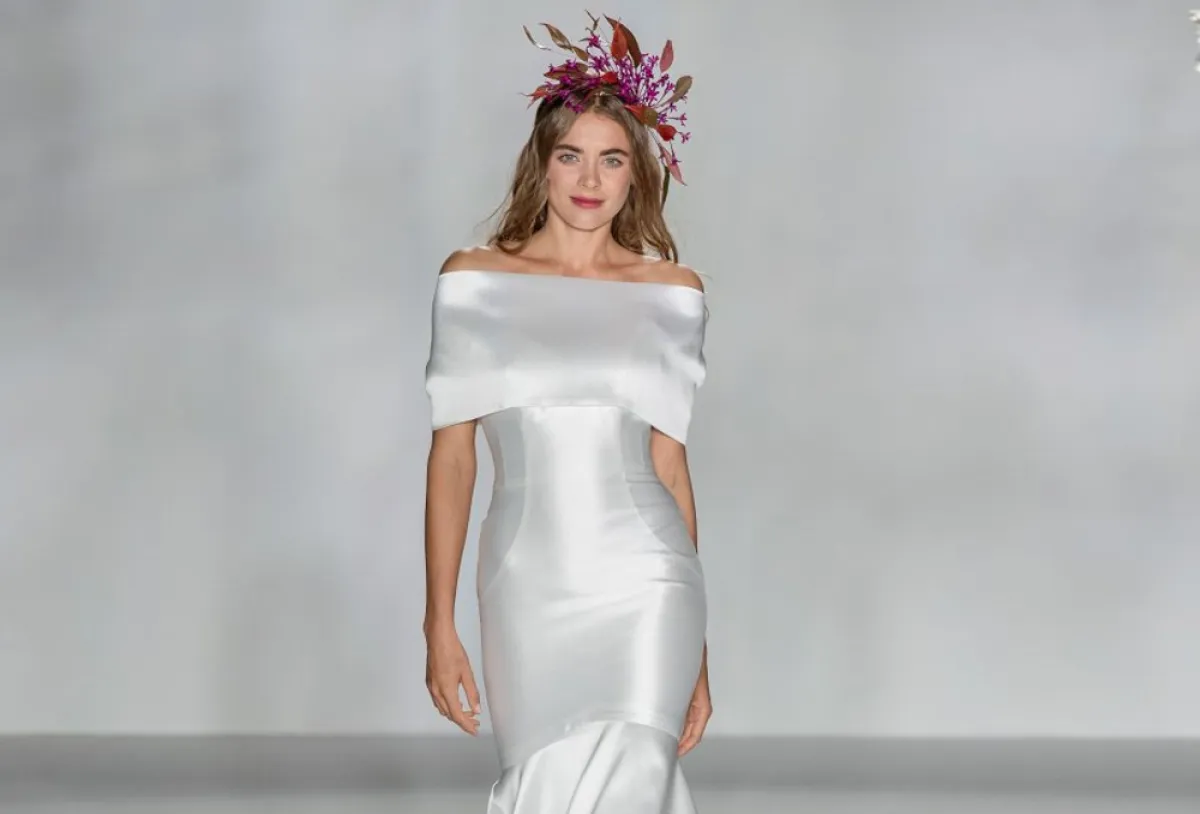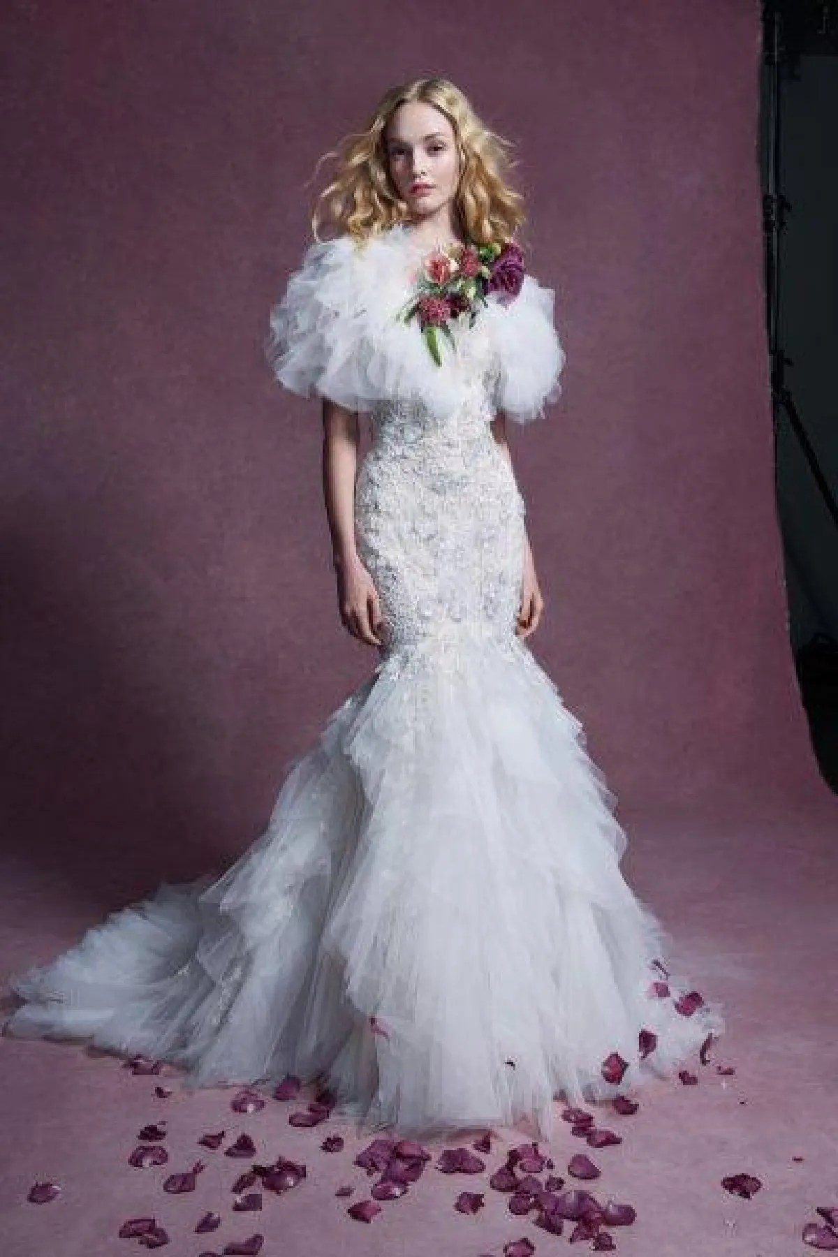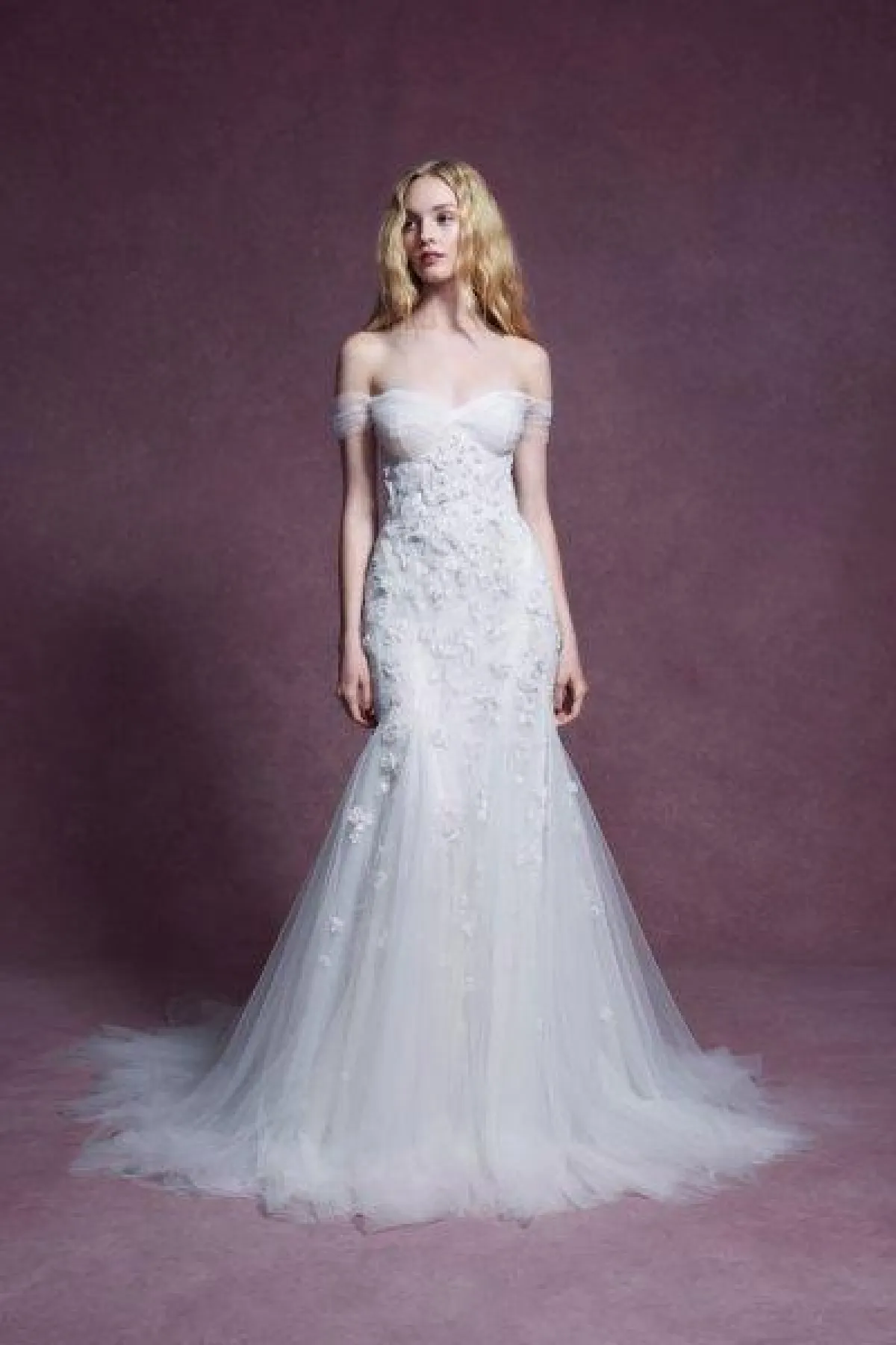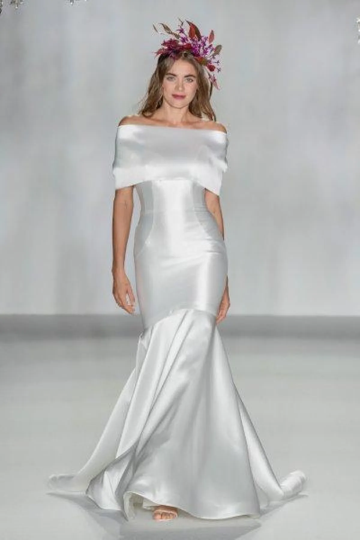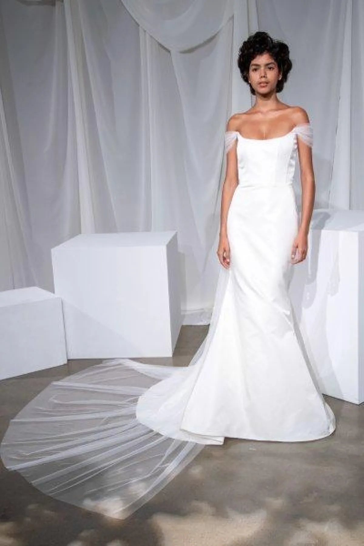 قدمت ماركة Amsale فستان زفاف ضيق بقصّة تايبست وبتصميم ناعم ينسدل منه ذيل طويل من التول، وهو كاشف للأكتاف.
