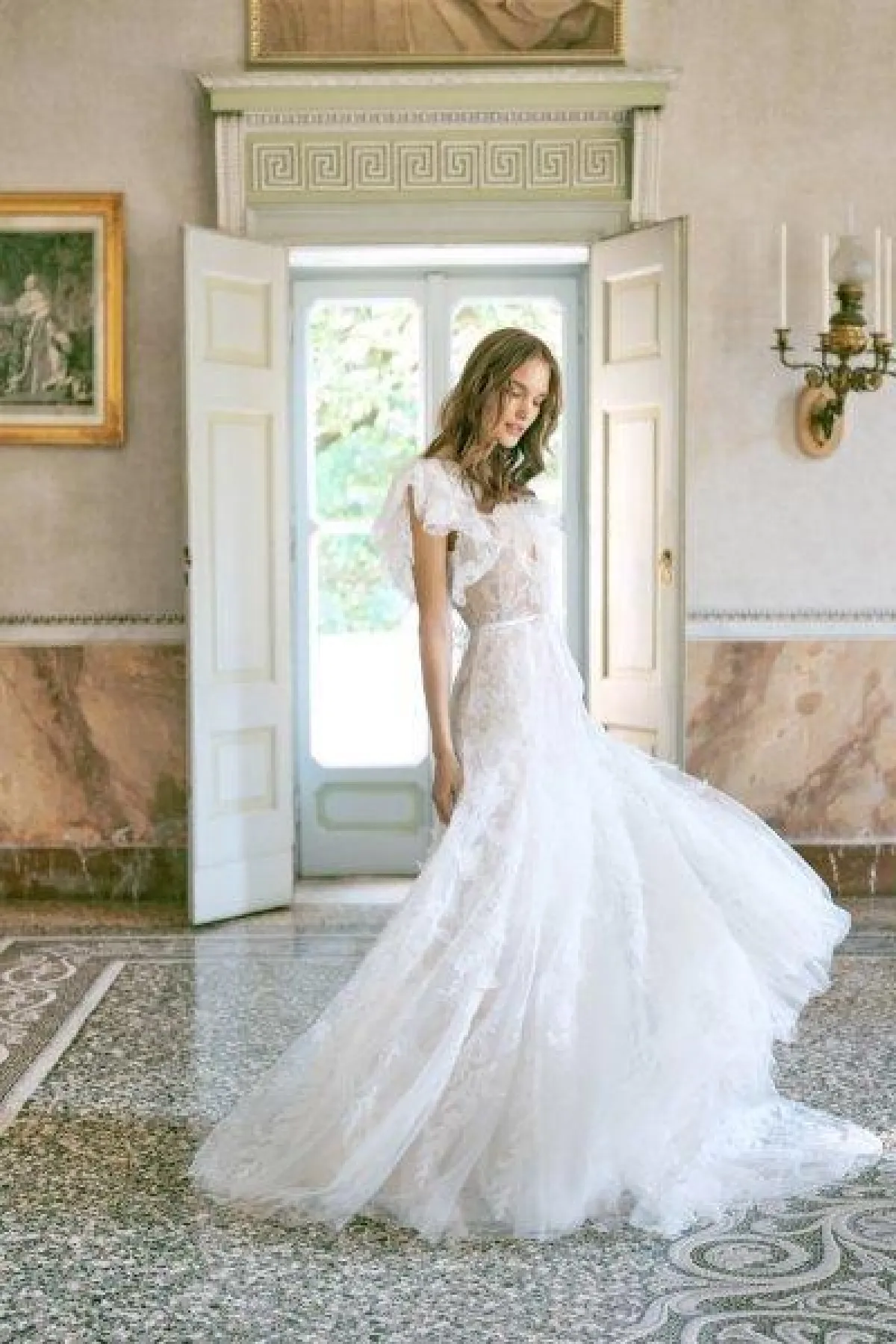 الفستان بأكمام قصيرة واسعة تضيف لمسة مرحة وحيوية للعروس.