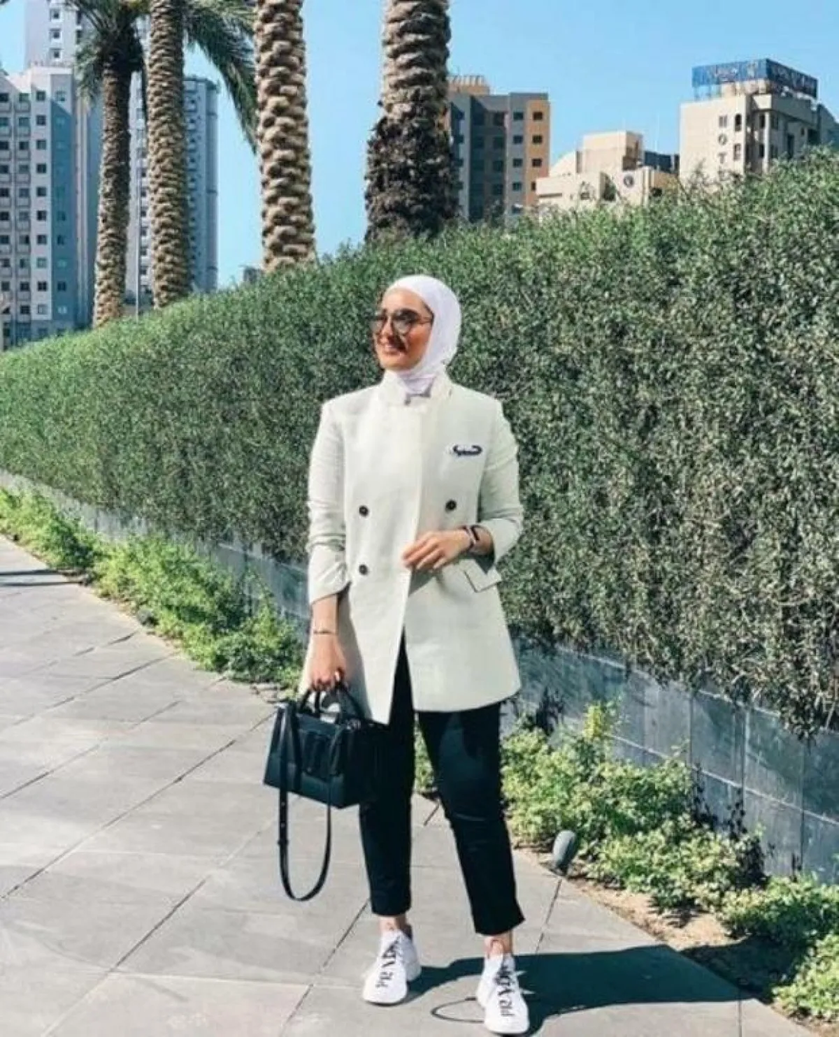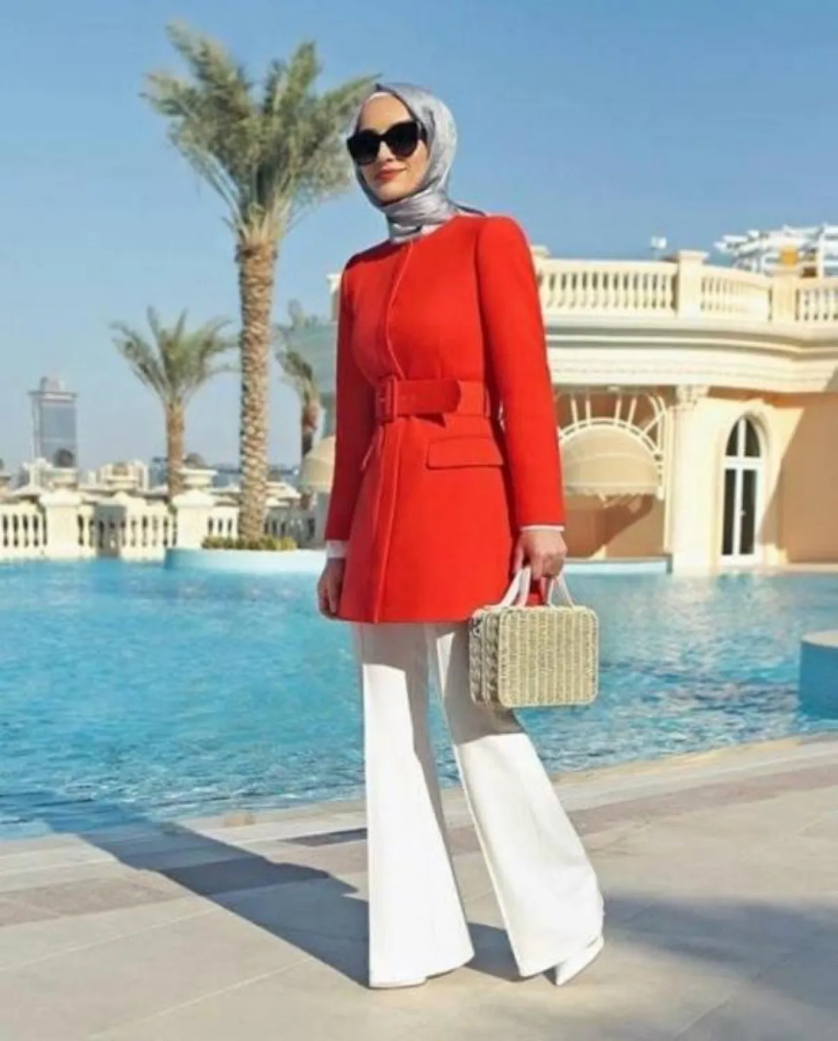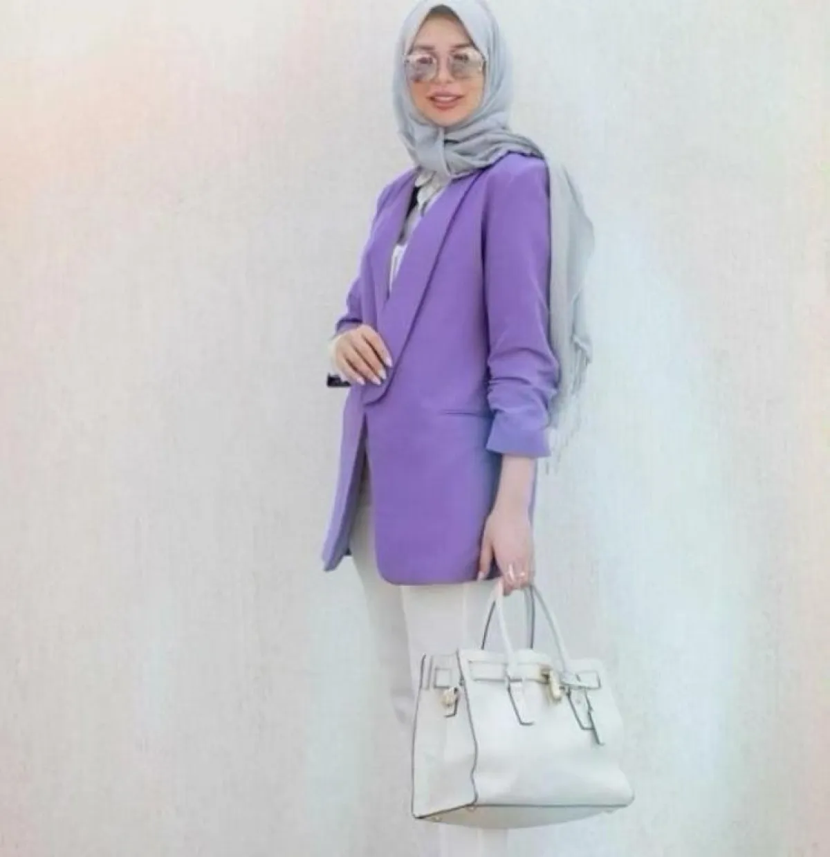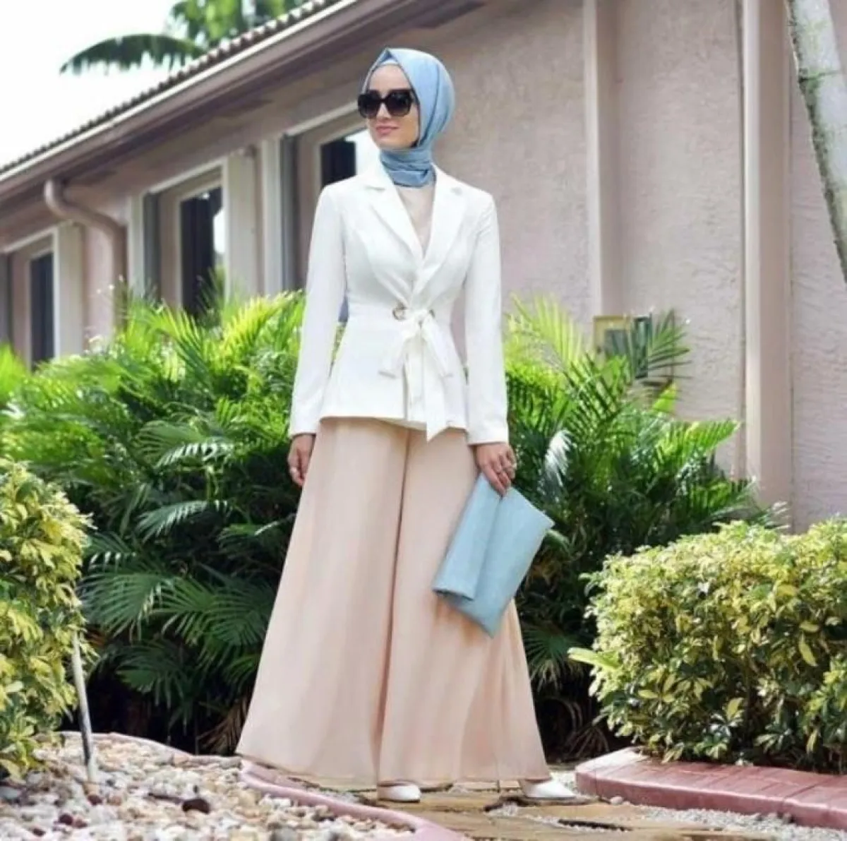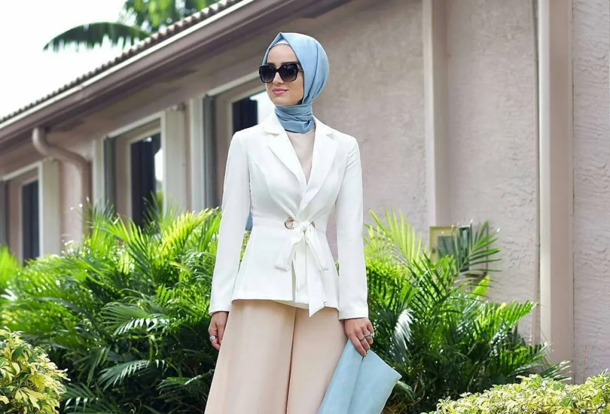 - نسقي البليزر القصير مع بنطال واسع الأرجل Wide Leg Pants لإطلالة محتشمة تناسب الحجاب، الجاكيت الأبيض مع البنطال سيشكلا ثنائي رائع لإطلالة النهار، جربي تنسيقهما مع حجاب وحقيبة باللون الأزرق السماوي