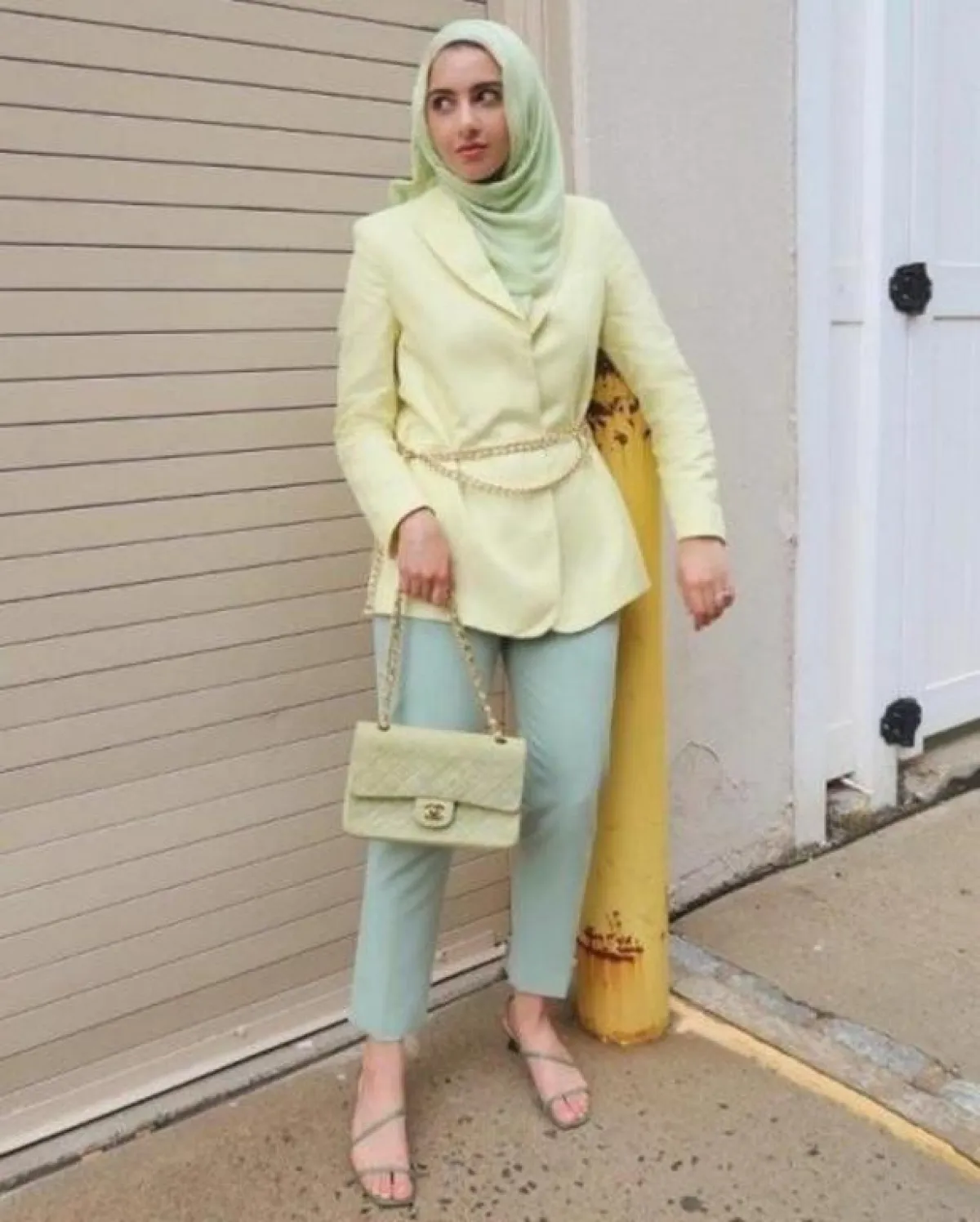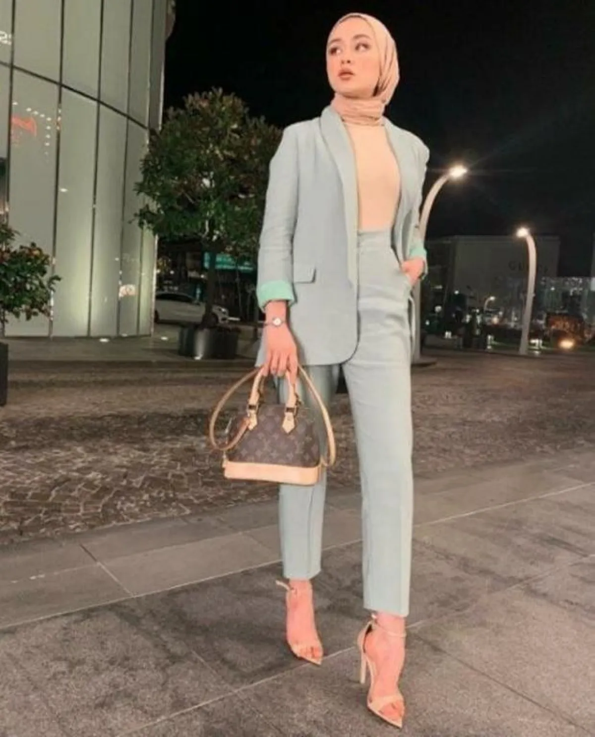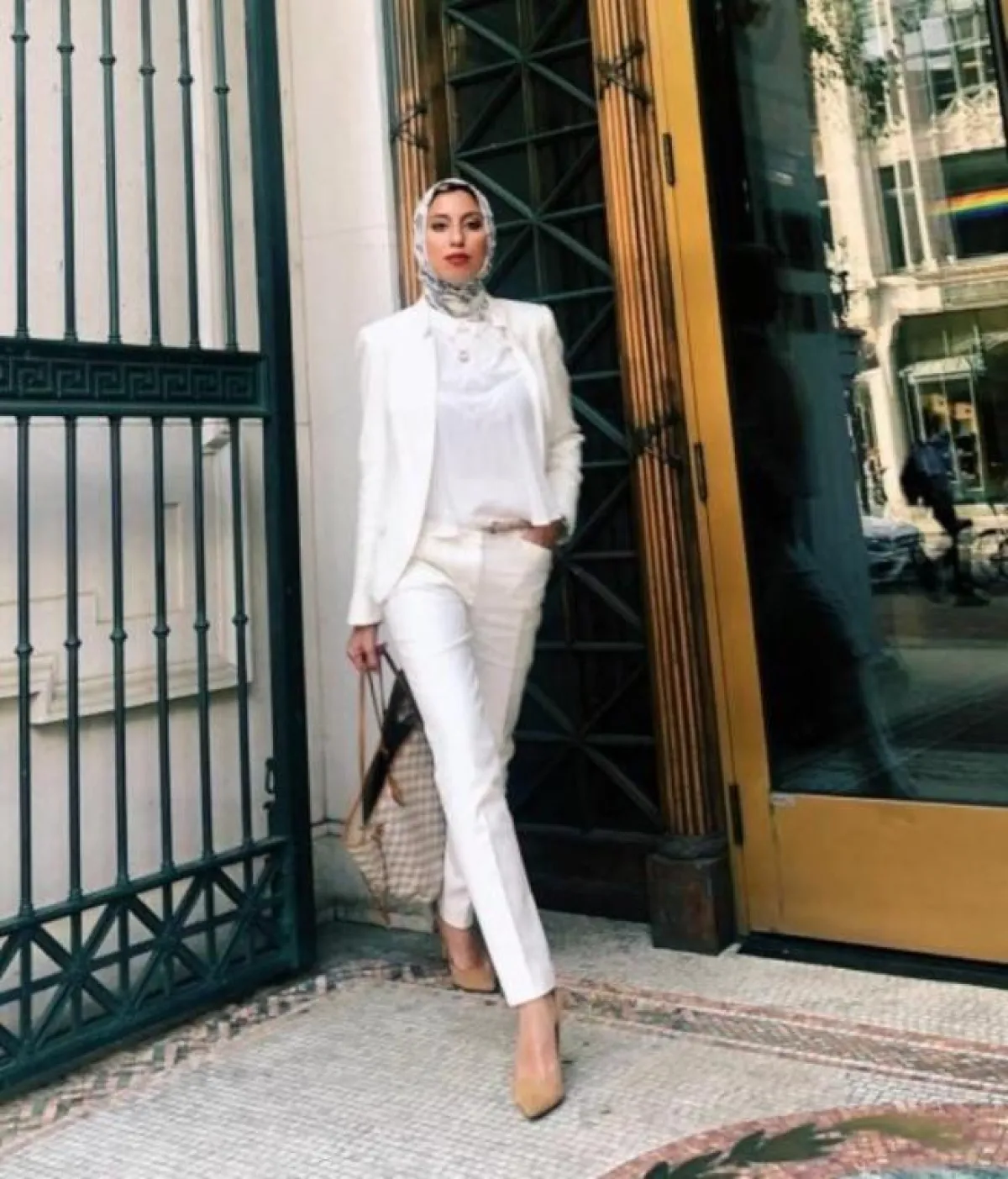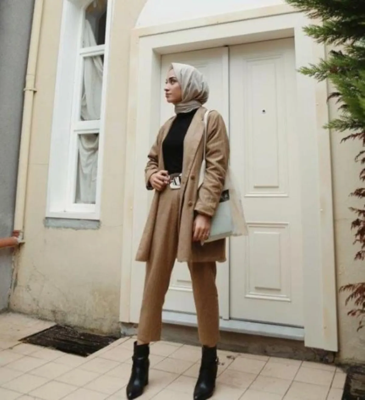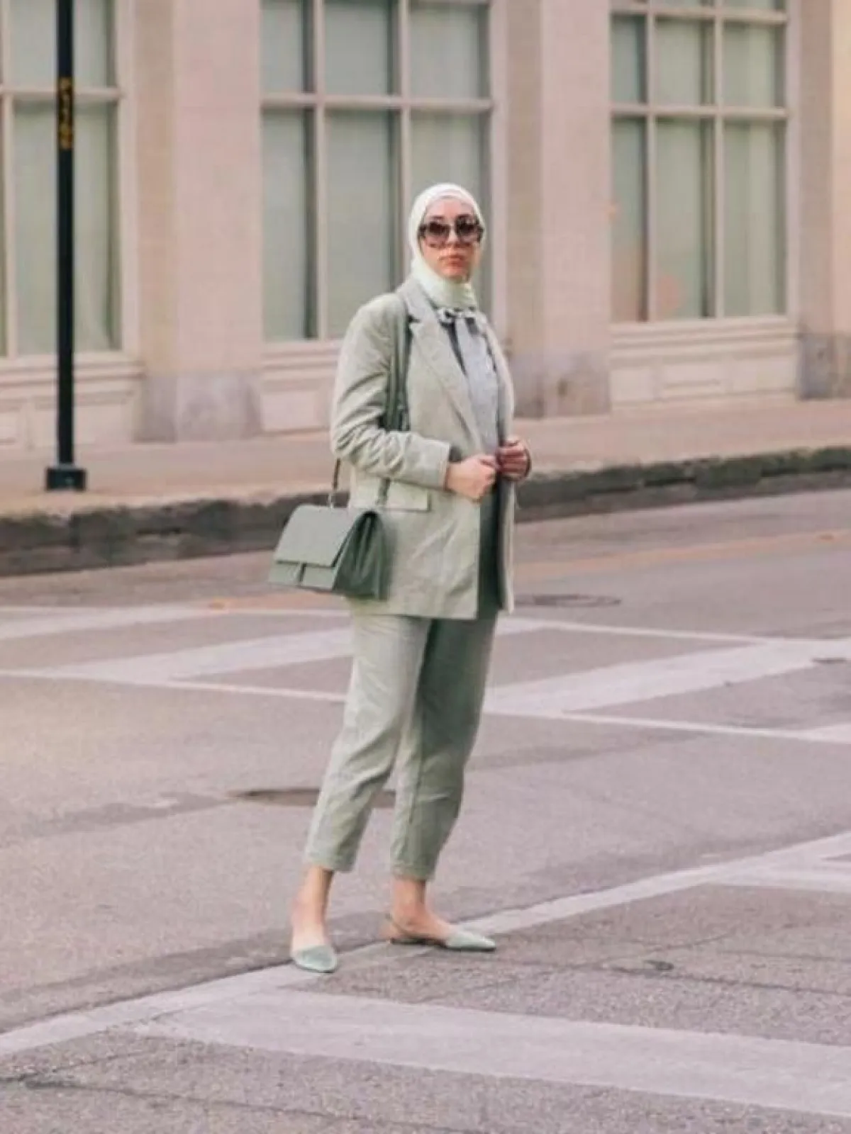 - نسقي البليزر القصير مع بنطال واسع الأرجل Wide Leg Pants لإطلالة محتشمة تناسب الحجاب، الجاكيت الأبيض مع البنطال سيشكلا ثنائي رائع لإطلالة النهار، جربي تنسيقهما مع حجاب وحقيبة باللون الأزرق السماوي