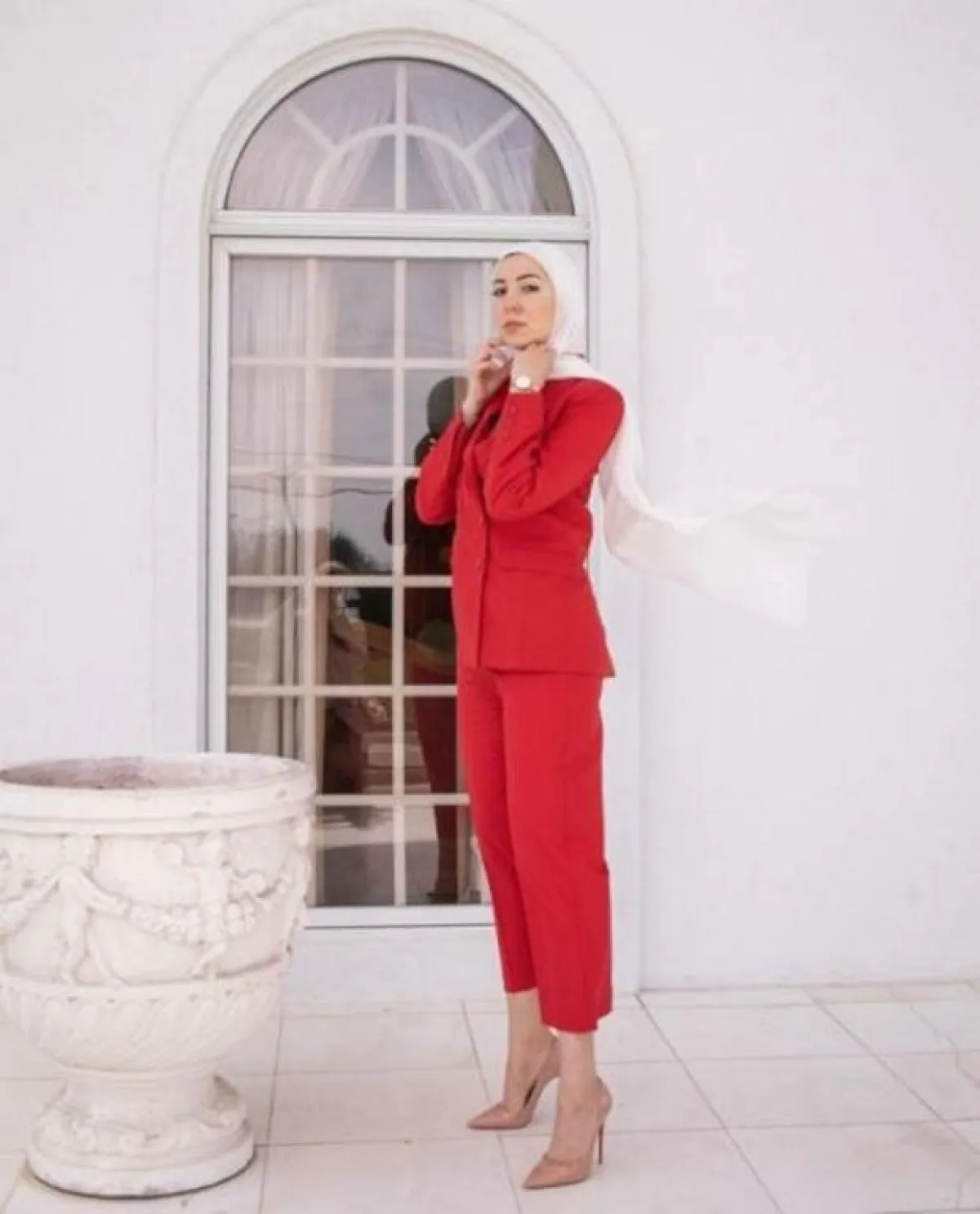 تسلحي بالجرأة وأعتمدي بدلة باللون الأحمر ولائميها مع طرحة بيضاء وأنتعلي حذاء Pointy بلون الجلد Nude shoes لخطوات واثقة على أن تكون الحقيبة من نفس اللون.