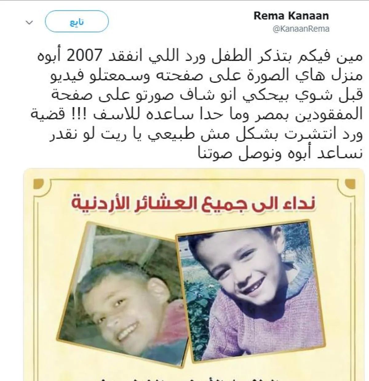 وجاء في تغريدة الناشطة الأردنية على تويتر: «مين فيكم بتذكر الطفل ورد اللي انفقد 2007. أبوه منزل هاي الصورة على صفحته وسمعت إله فيديو قبل شوي بيحكي انو شاف صورته على صفحة المفقودين بمصر وما حدا ساعده للاسف!!! قضية ورد انتشرت بشكل مش طبيعي يا ريت لو نقدر نساعد أبوه ونوصل صوتنا».