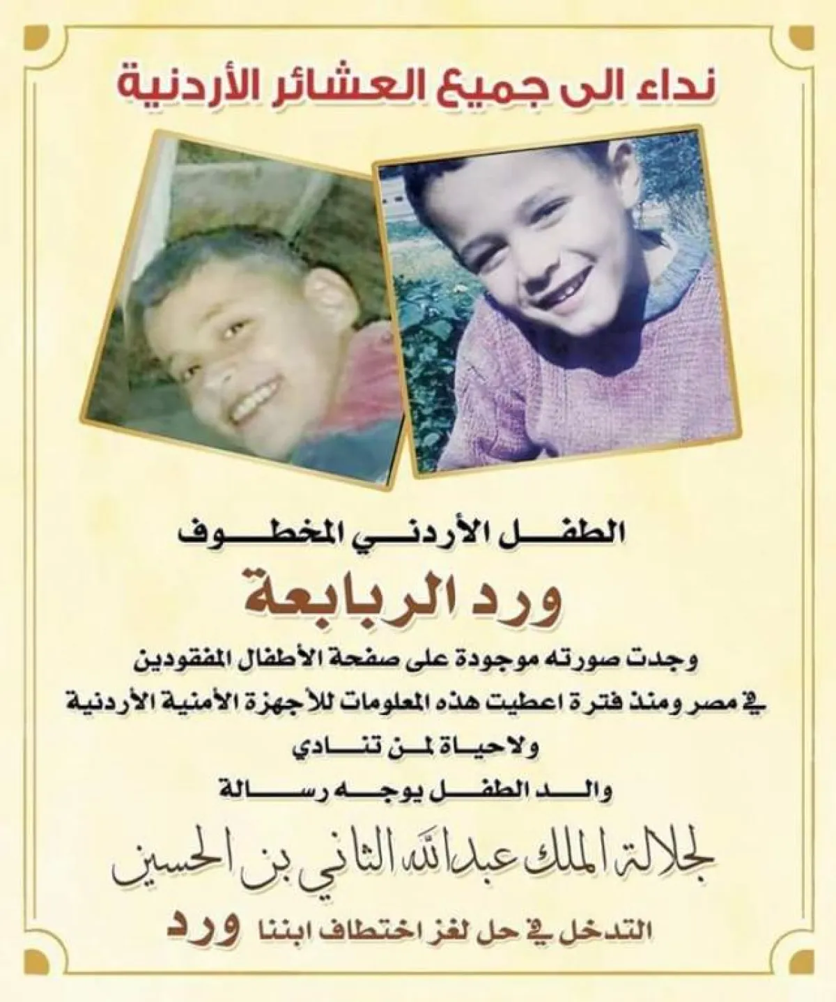 قضية اختفاء شغلت الرأي العام بأكمله في المملكة الأردنية خلال العام 2007، إنها قضية الطفل ورد، الذي فُقد أثره تماماً وفشلت جميع المحاولات الرسمية والشعبية بالعثور عليه خلال تلك الفترة. إلا أن تطوراً مفاجئاً وكبيراً حدث مؤخراً، عندما استدعت وزارة الخارجية الأردنية والد الطفل ورد عقب تداول صورته على إحدى صفحات الأطفال المفقودين في مصر. لتعود القضية إلى الواجهة مرة أخرى بعد 12 عاماً من الاختفاء الغامض.