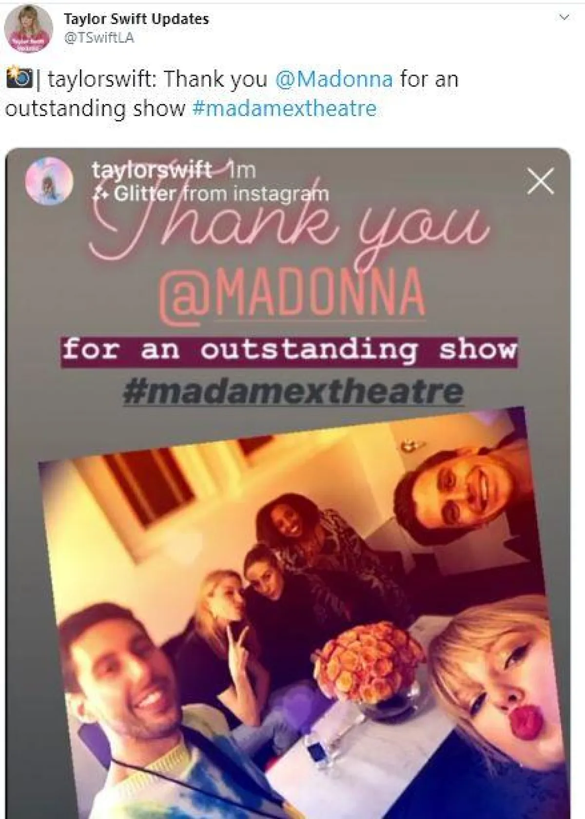 | taylorswift: Thank you @Madonna for an outstanding show #madamextheatre pic.twitter.com/CLsX5Dqfy2