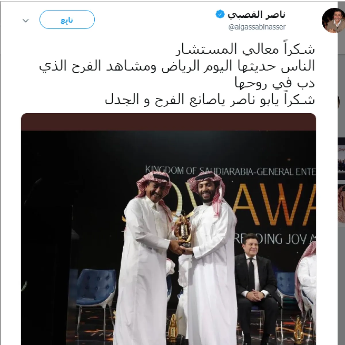 بداية، غرَّد الممثل السعودي ناصر القصبي بقوله: "شكرًا معالي المستشار.. الناس حديثها اليوم الرياض ومشاهد الفرح الذي دب في روحها.. شكرًا أبو ناصر يا صانع الفرح والجدل".