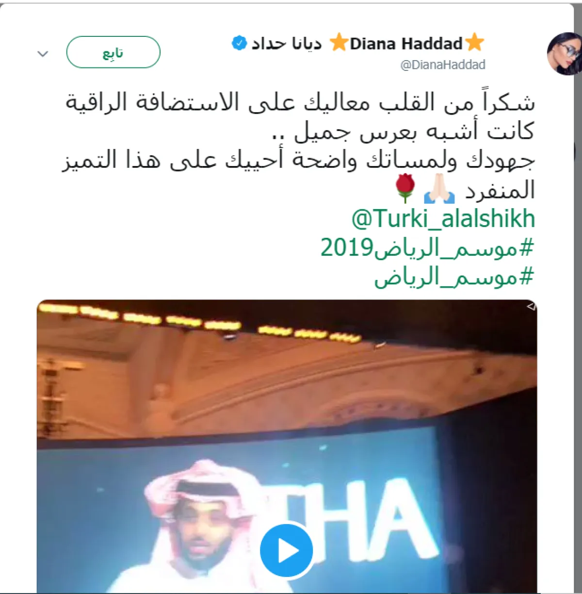 وعن الفنانة ديانا حداد، فقد وصفته بالعرس، حيث غرَّدت على تويتر قائلة: "شكرًا من القلب معاليك على الاستضافة الراقية.. كانت أشبه بعُرْسٍ جميل.. جهودك ولمساتك واضحة.. أحييك على هذا التميز المنفرد"