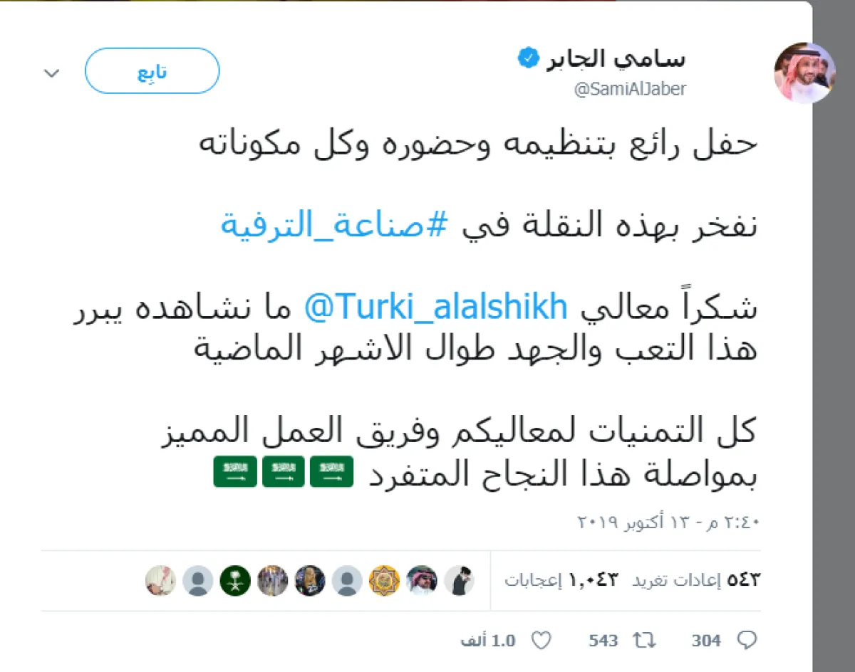 فيما غرَّد اللاعب سامي الجابر بقوله: "حفل رائع بتنظيمه وحضوره وكل مكوناته.. نفخر بهذه النقلة في #صناعة_الترفيه.. وشكرًا معالي @Turki_alalshikh.. ما نشاهده يبرِّر هذا التعب والجهد طوال الأشهر الماضية.. كل التمنيات لمعاليكم وفريق العمل المميز بمواصلة هذا النجاح المتفرد".