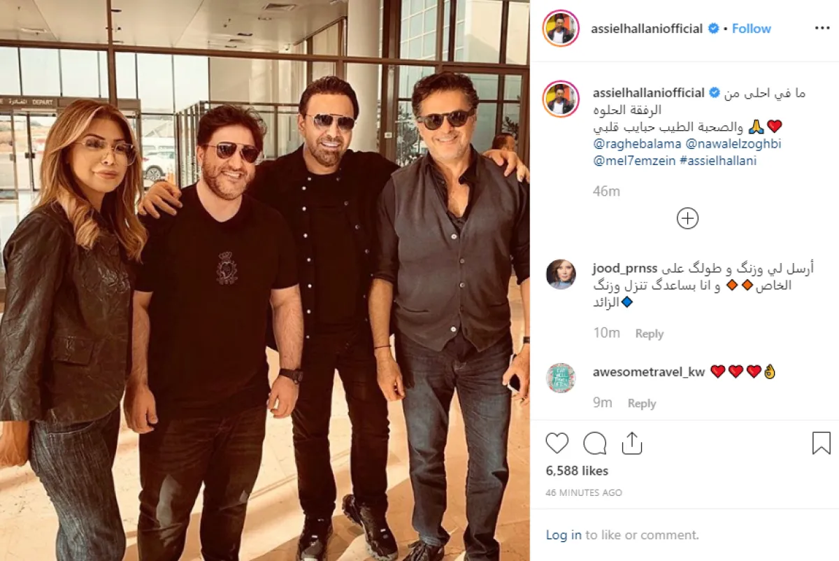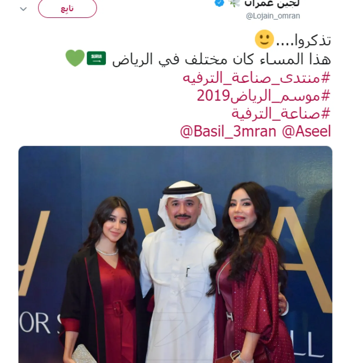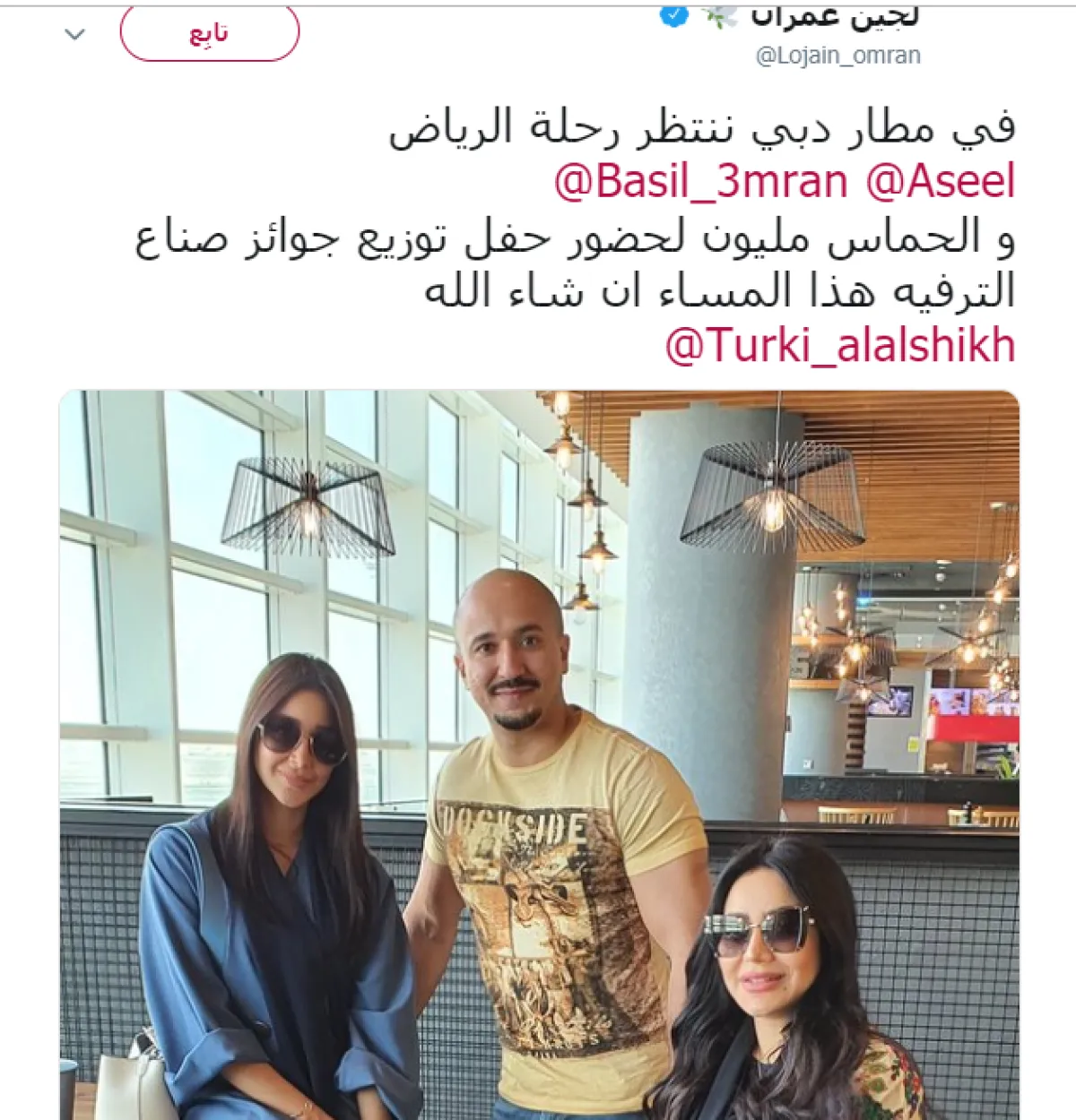 وبحماسة نشرت لجين عمران صورتها مع أشقائها أسيل وباسل في المطار، معلِّقة: "في مطار دبي ننتظر رحلة الرياض والحماس مليون لحضور حفل توزيع جوائز صناع الترفيه هذا المساء إن شاء الله"، وتابعت بتغريدة أخرى قالت خلالها: "بو ناصر صرنا جاهزين وجايينكم كلنا حماس"، ثم نشرت صورة أخرى قالت خلالها: "تذكَّروا هذا المساء كان مختلفًا في الرياض". وعن ياسر التويجري قالت: "هذا البني آدم له معزَّة عند كل العائلة من صغيرنا إلى كبيرنا.. عسى ربي يسعده"، وأضافت: "يعرف كيف يتعامل مع أسيل".