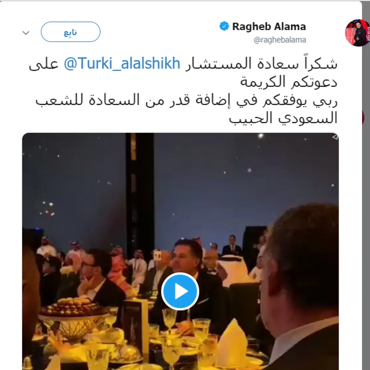 كما حضر الحفلَ الفنانُ راغب علامة، وغرَّد شاكرًا تركي آل الشيخ، فقال "شكرًا سعادة المستشار تركي آل الشيخ على دعوتكم الكريمة، ربي يوفقكم في إضافة قدر من السعادة للشعب السعودي الحبيب".