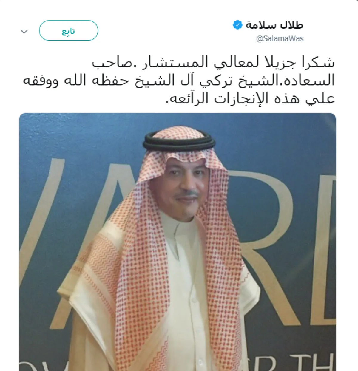 وأيضًا كان للفنان طلال سلامة حضوره في الحفل، وغرد عنه بقوله: "شكرًا جزيلًا لمعالي المستشار صاحب السعادة الشيخ تركي آل الشيخ.. حفظه الله ووفقه على هذه الإنجازات الرائعة".