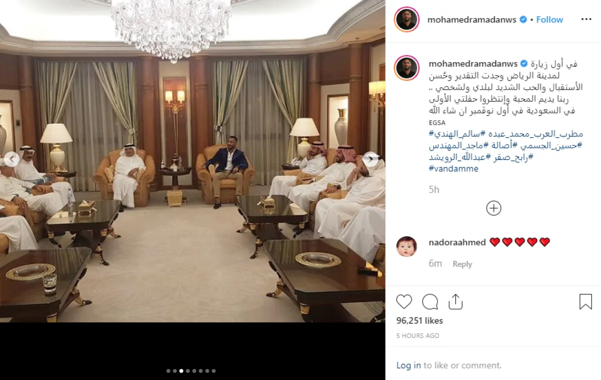 وقد قاد الفنان محمد رمضان الطائرة ليأتي بزملائه إلى السعودية، لحضور حفل منتدى صناعة الترفيه بشكل خاص، وقد علَّق قائلًا: "في أول زيارة لمدينة الرياض وجدت التقدير وحسن الاستقبال والحب الشديد لبلدي ولشخصي.. ربنا يديم المحبة.. وانتظروا حفلتي الأولى في السعودية في أول نوفمبر إن شاء الله".