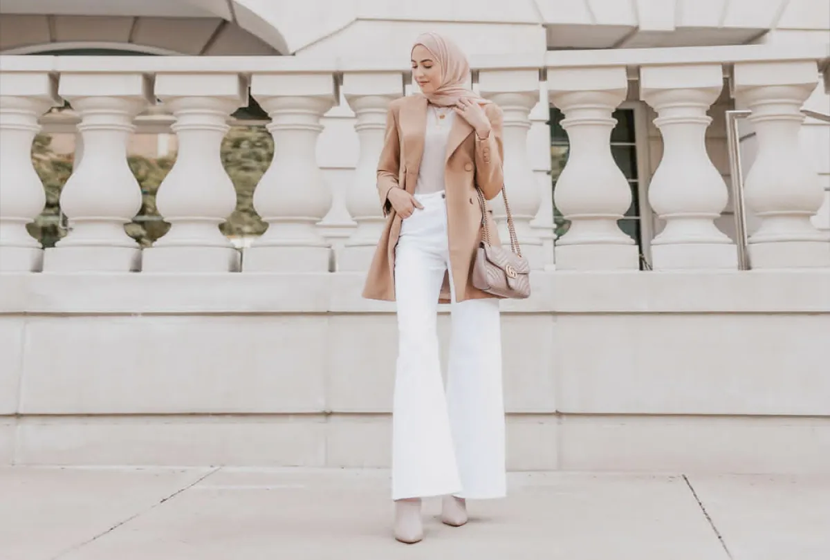 نسقي البنطلون الأبيض مع توب باللون البيج ونسقي معه حجاب بنفس اللون واختاري حذاء بكعب عال.