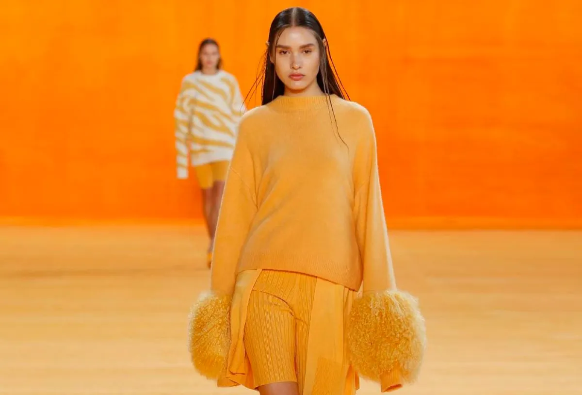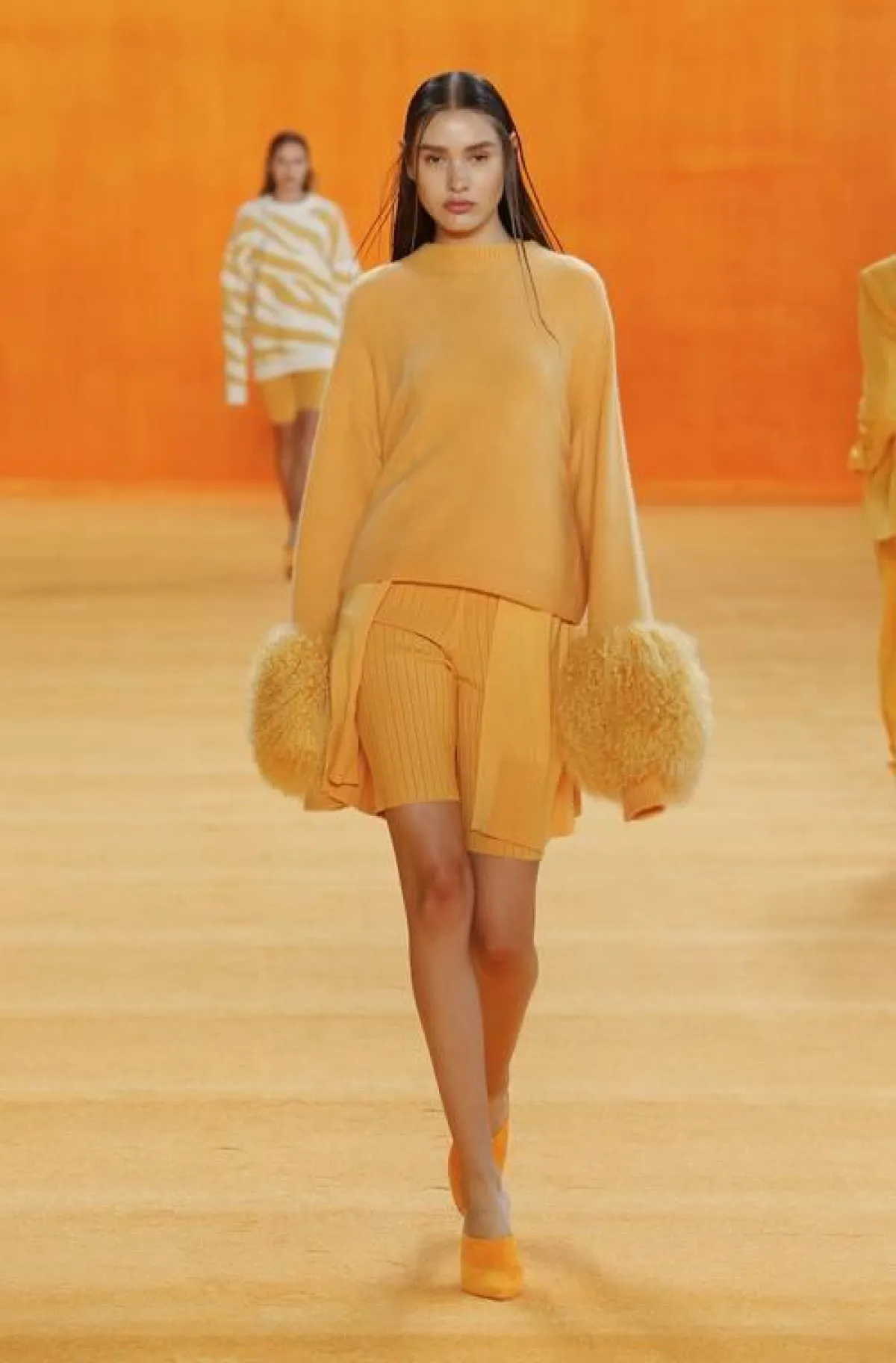 ذهبت دور الأزياء البارزة مثل توري بورش، إلى تقديم هذا اللون القوي والدافيء بستايل اللون الموحد، من الرأس إلى أخمص القدمين، لاطلالة نسائية جريئة.