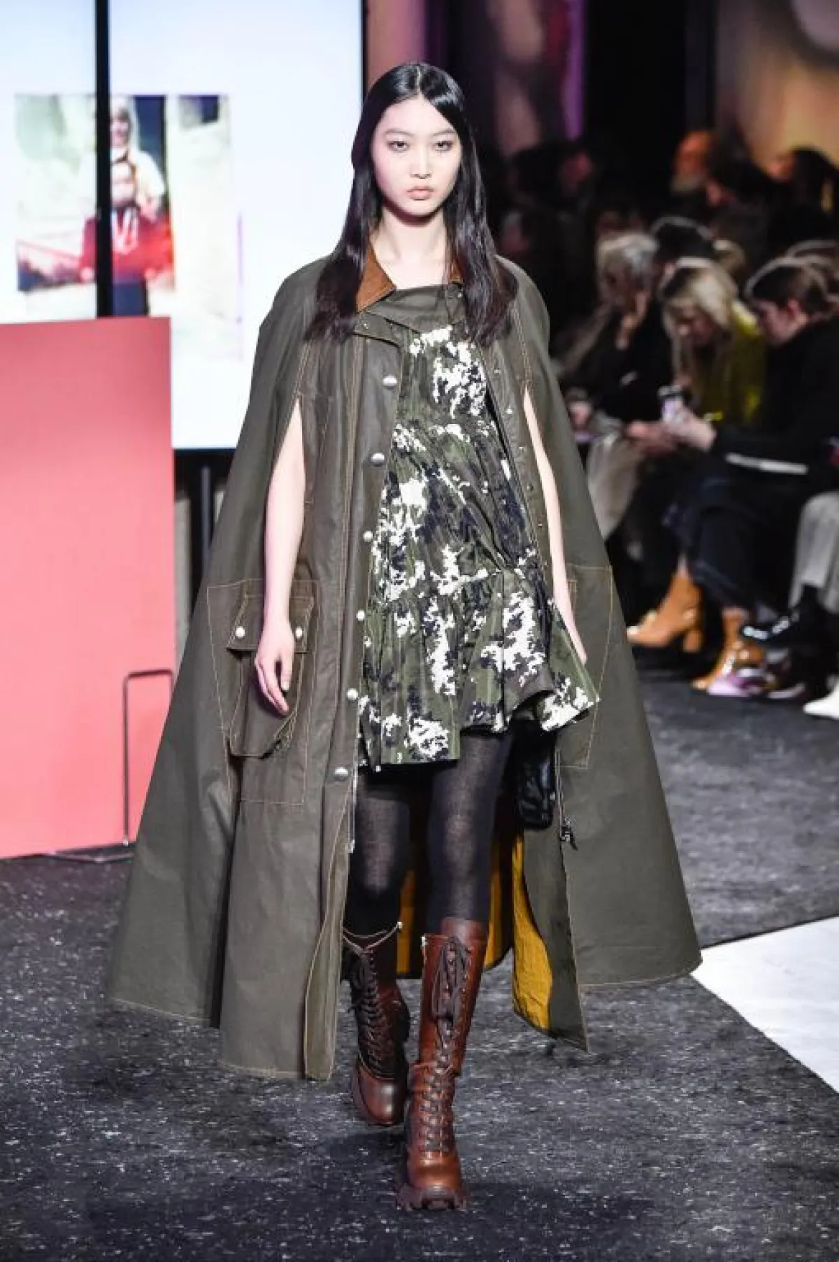 أما دار ميوميو فذهبت إلى نمط أكثر عصرية، حيث قدمت بالطو واق من المطر جمع بين تصميم الترنش والكاب في الوقت نفسه، وهو خيار عصري يناسب الخريف أكثر من الشتاء.