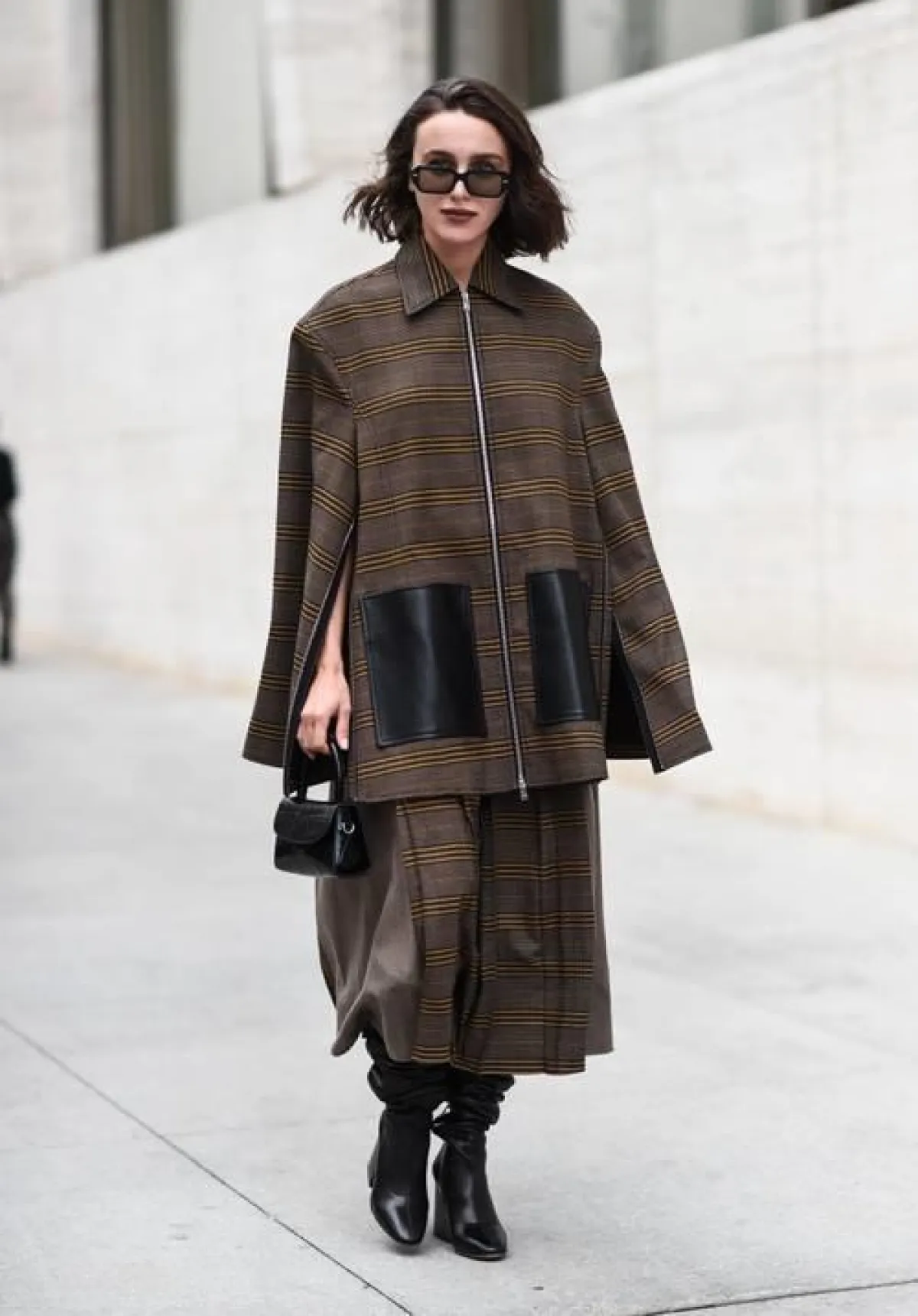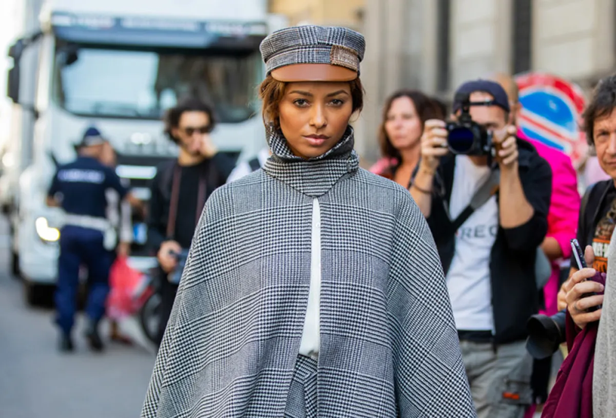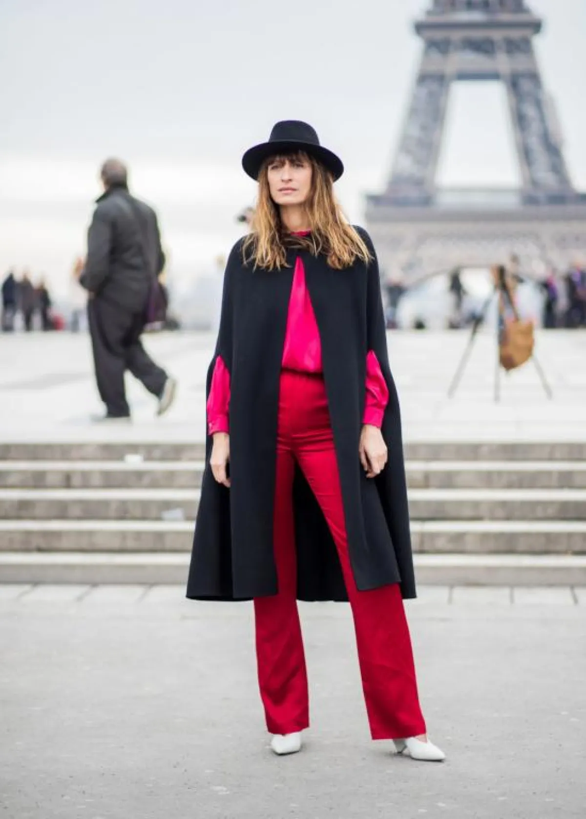 ظهرت عارضة الأزياء الفرنسية ح كارولين مايجريت ببالطو الكاب الأسود فوق إطلالة حمراء نابضة بالحياة. كذلك ظهر نمط الكاروهات كخيار عصري لتصميم الكاب سوء مع تنورة قصيرة أو بنطلون سكيني مصقول بخامة شتوية فاخرة مثل الجلد.