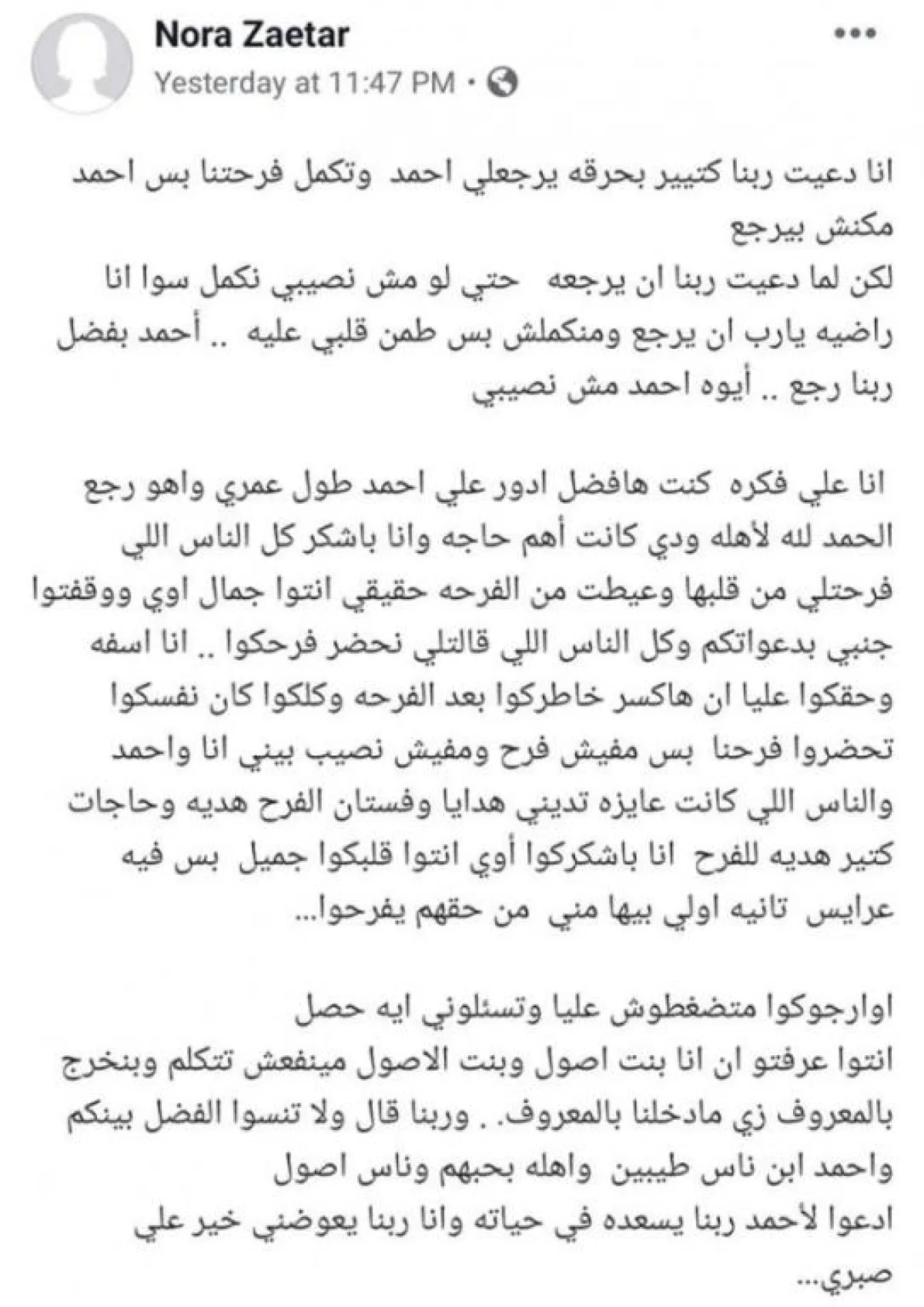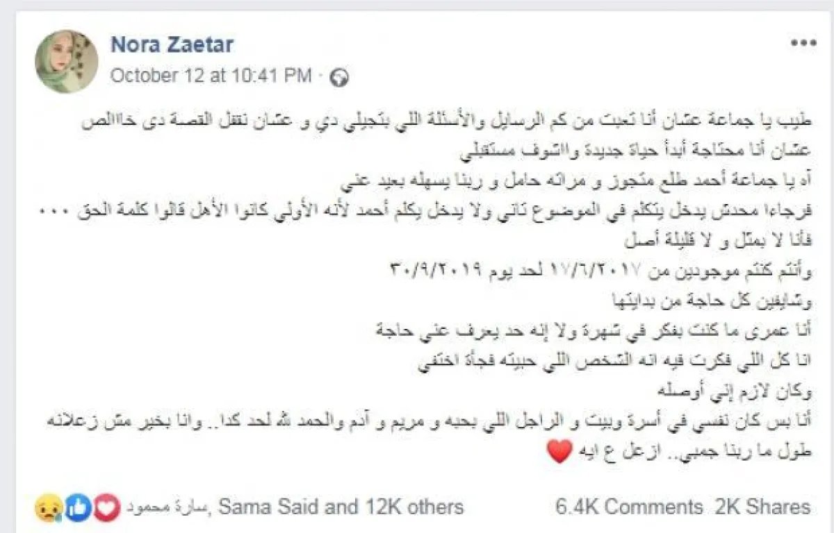 وكتبت «نورا»، عبر حسابها الشخصي بموقع «فيسبوك»: «طيب يا جماعة عشان أنا تعبت من كم الرسايل والأسئلة اللي بتجيلي دي، وعشان نقفل القصة دي خالص؛ لأني محتاجة أبدأ حياة جديدة وأشوف مستقبلي، أحمد طلع متجوز ومراته حامل وربنا يسهله بعيد عني؛ فرجاءً محدش يدخل يتكلم في الموضوع تاني، ولا يدخل يكلم أحمد؛ لأنه الأولى كانوا الأهل قالوا كلمة الحق».