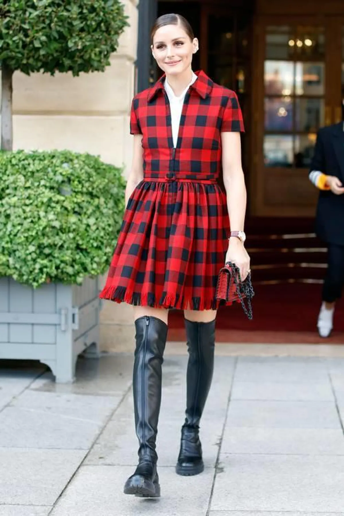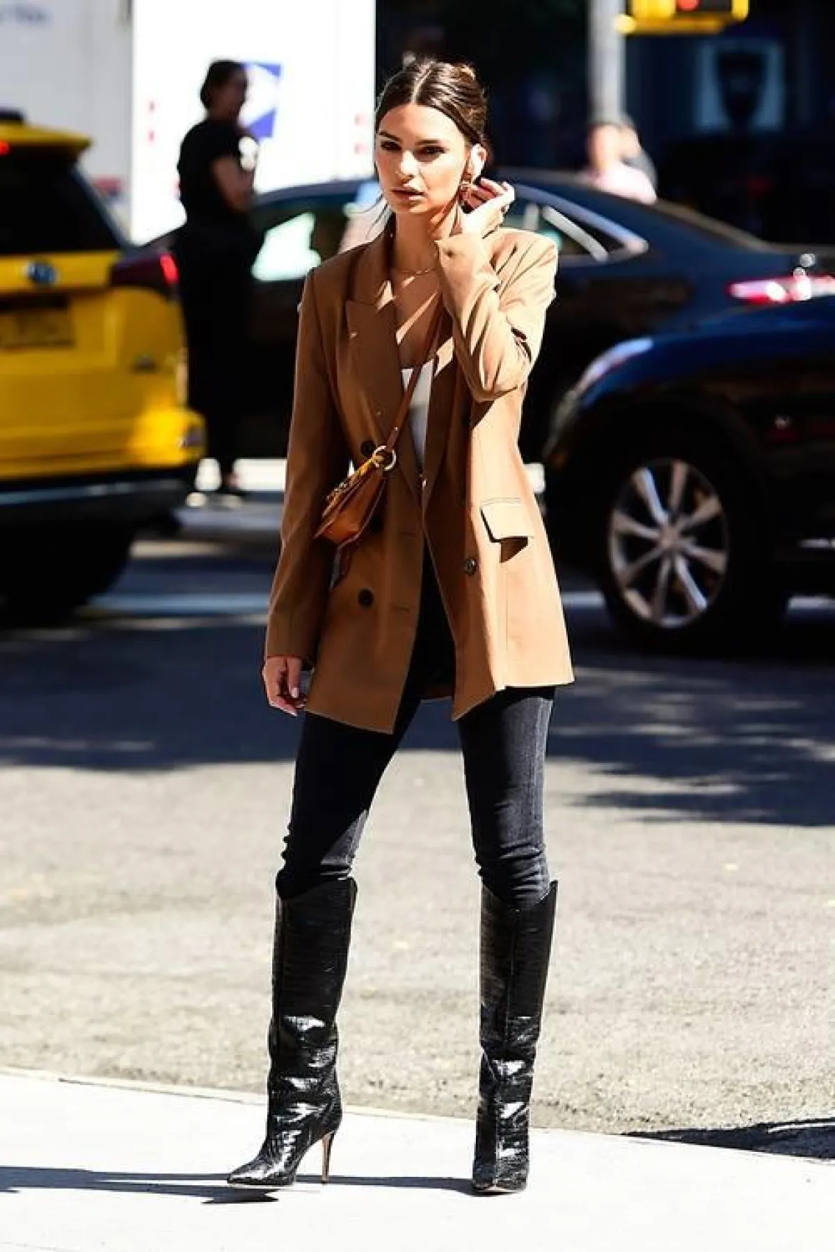 لا شيء يجعل زوجًا من أحذية البوت المزودة برقبة تصل إلى الركبة، يبدو أكثر نعومة من تنورة قصيرة مفعمة بالأنوثة. شاهدي ستايل الممثلة والعارضة الأمريكية كايا جربر، حين اختارت تايور من التويد الزيتوني، وانتعلت معه حذاء البوت الأسود بعنق يخفي ساقيها حتى الركبة.