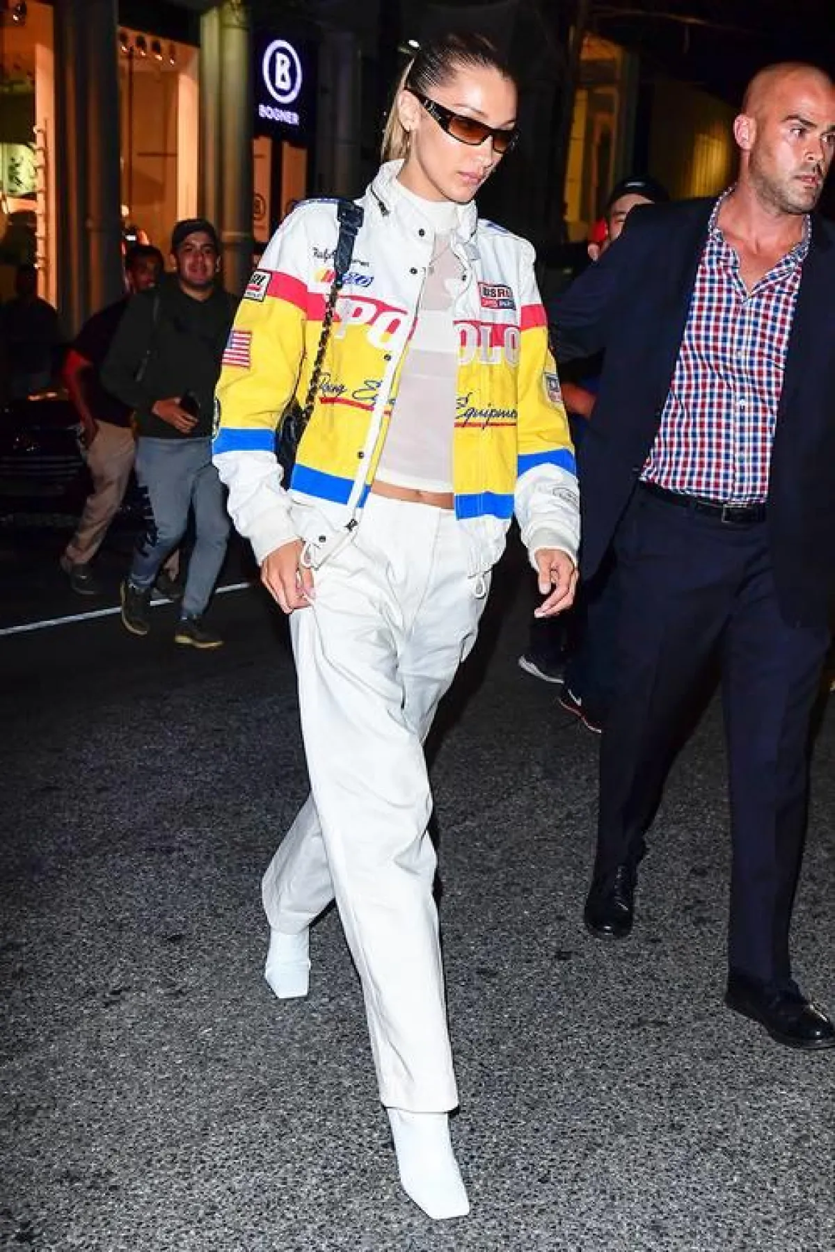تضيف الأحذية المربعة مجرد لمسة عصرية لاطلالتكِ. استلهمي طرق تنسيق هذا التصميم المربع من الأمام، من عارضة الأزياء بيلا حديد، التي اختارت اللون الأبيض ونسقته مع اطلالة رياضية.