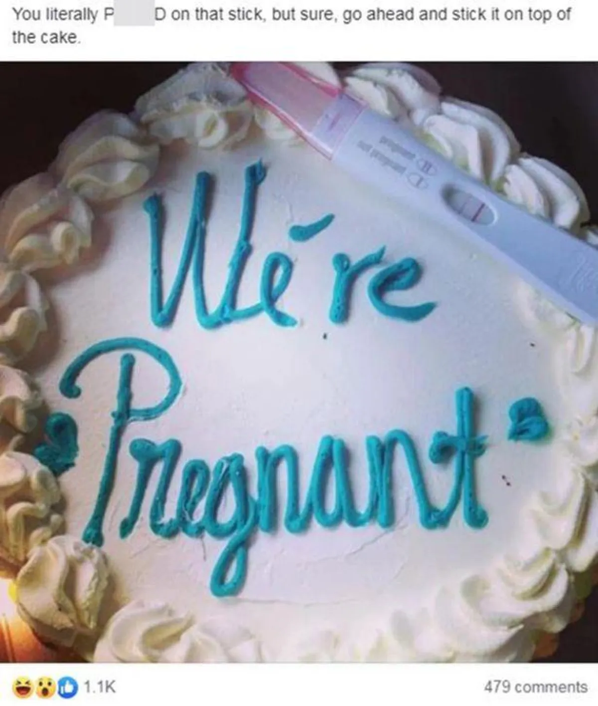 تُظهر صورة الكعكة كما نُشرت على وسائل التواصل الاجتماعي مصنوعة ومُزينة بدقة وحرفية، وقد قامت السيدة بتزيينها بلون الكريمة الأبيض والأزرق، وكتبت عليها «نحن حوامل» ويظهر شريط اختبار الحمل بجانب الكتابة، لكن الناس ثاروا من فكرة عصا قد تم التبول عليها، وقد انتقدوا المرأة بسبب «قلة النظافة».