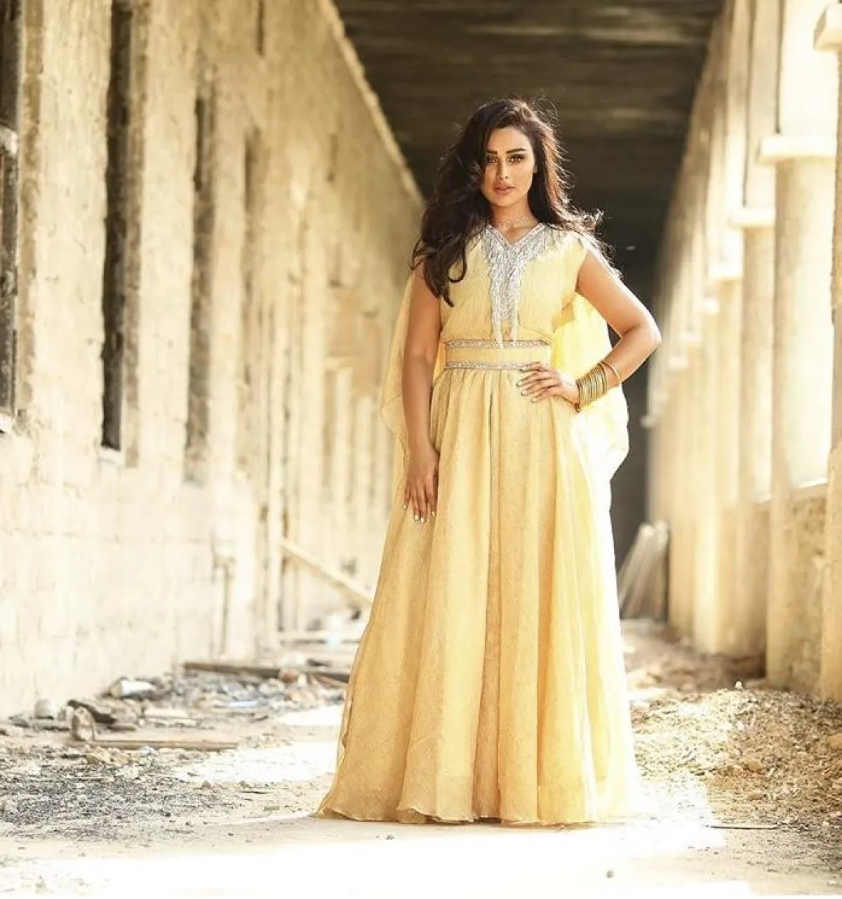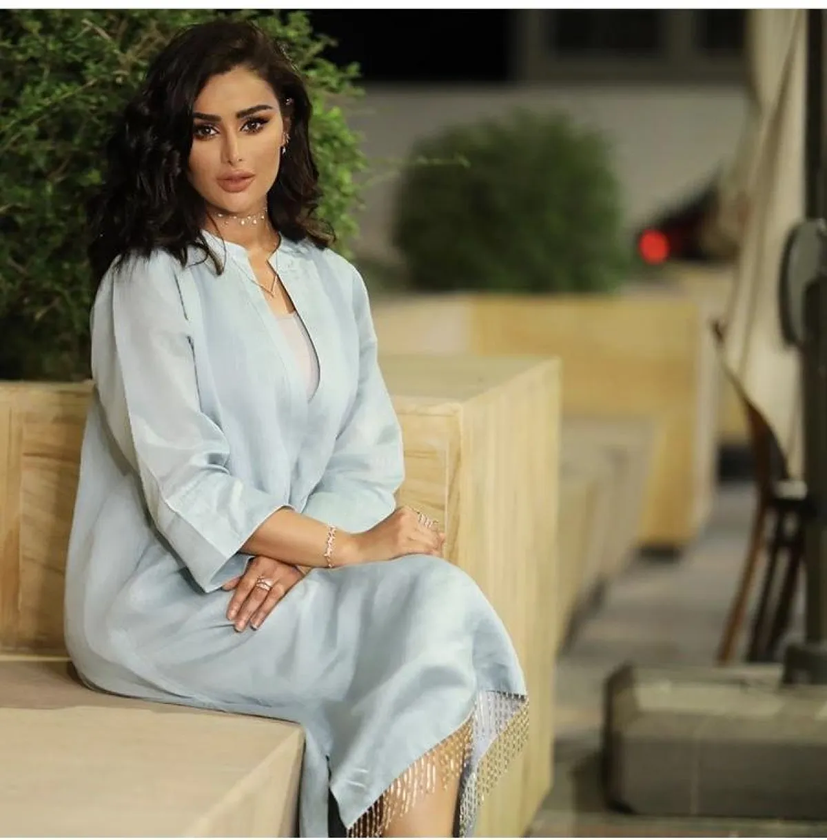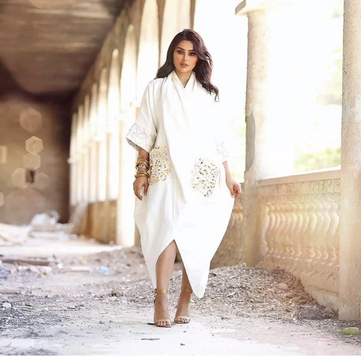 لفتنا هذا الموديل من عهود العنزي باختيار الجلباب الأبيض القصير، مع تصميم الـ Wrape الذي منحها طولًا مضاعفًا، بخاصة عندما نسقت معه صندلًا برباط الكاحل بلون النود النحاسي.