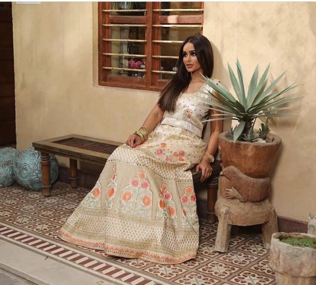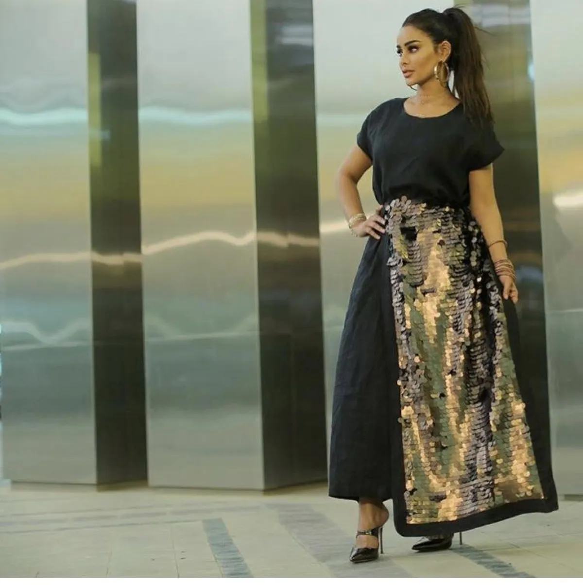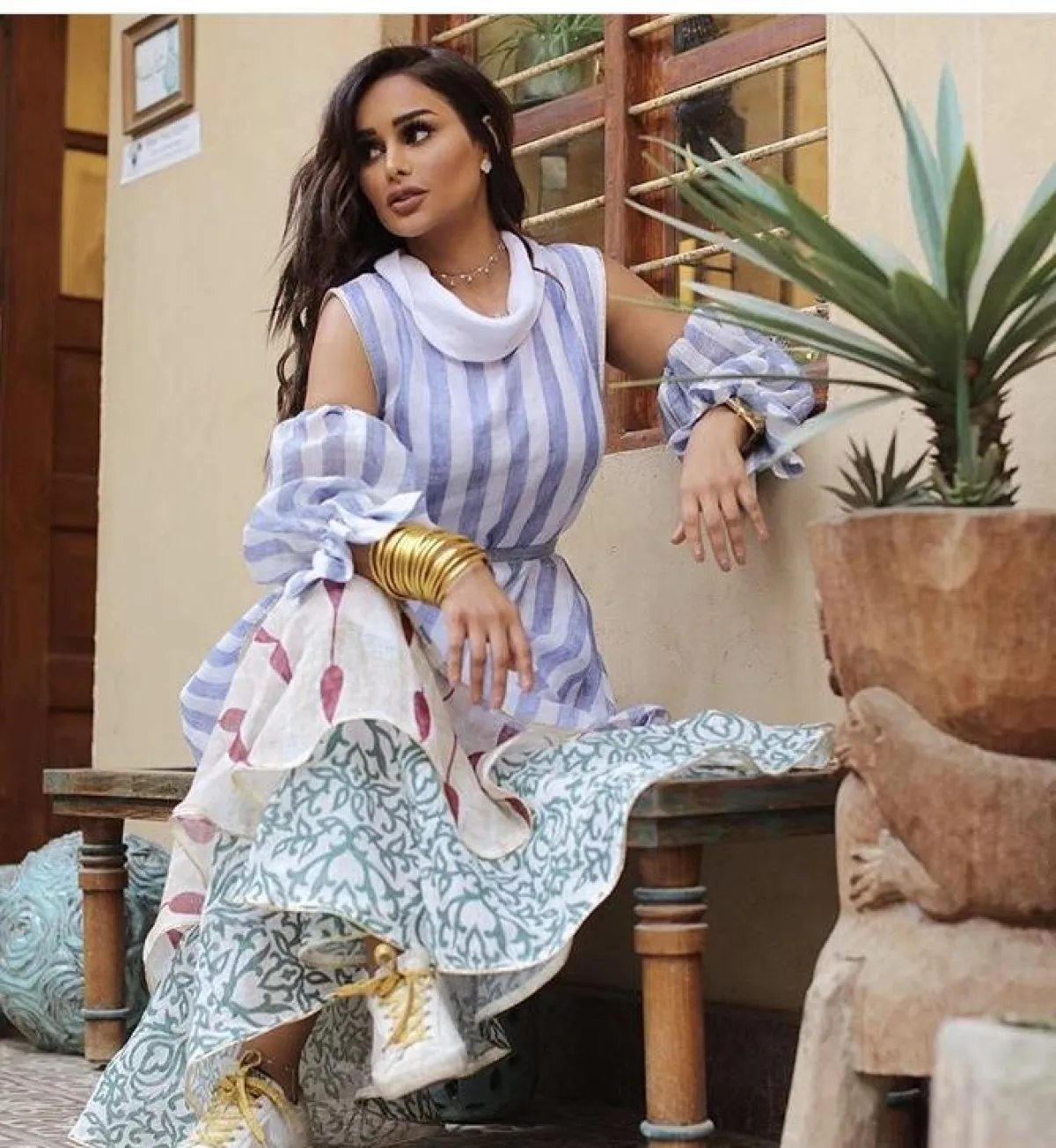 لفتنا هذا الموديل من عهود العنزي باختيار الجلباب الأبيض القصير، مع تصميم الـ Wrape الذي منحها طولًا مضاعفًا، بخاصة عندما نسقت معه صندلًا برباط الكاحل بلون النود النحاسي.